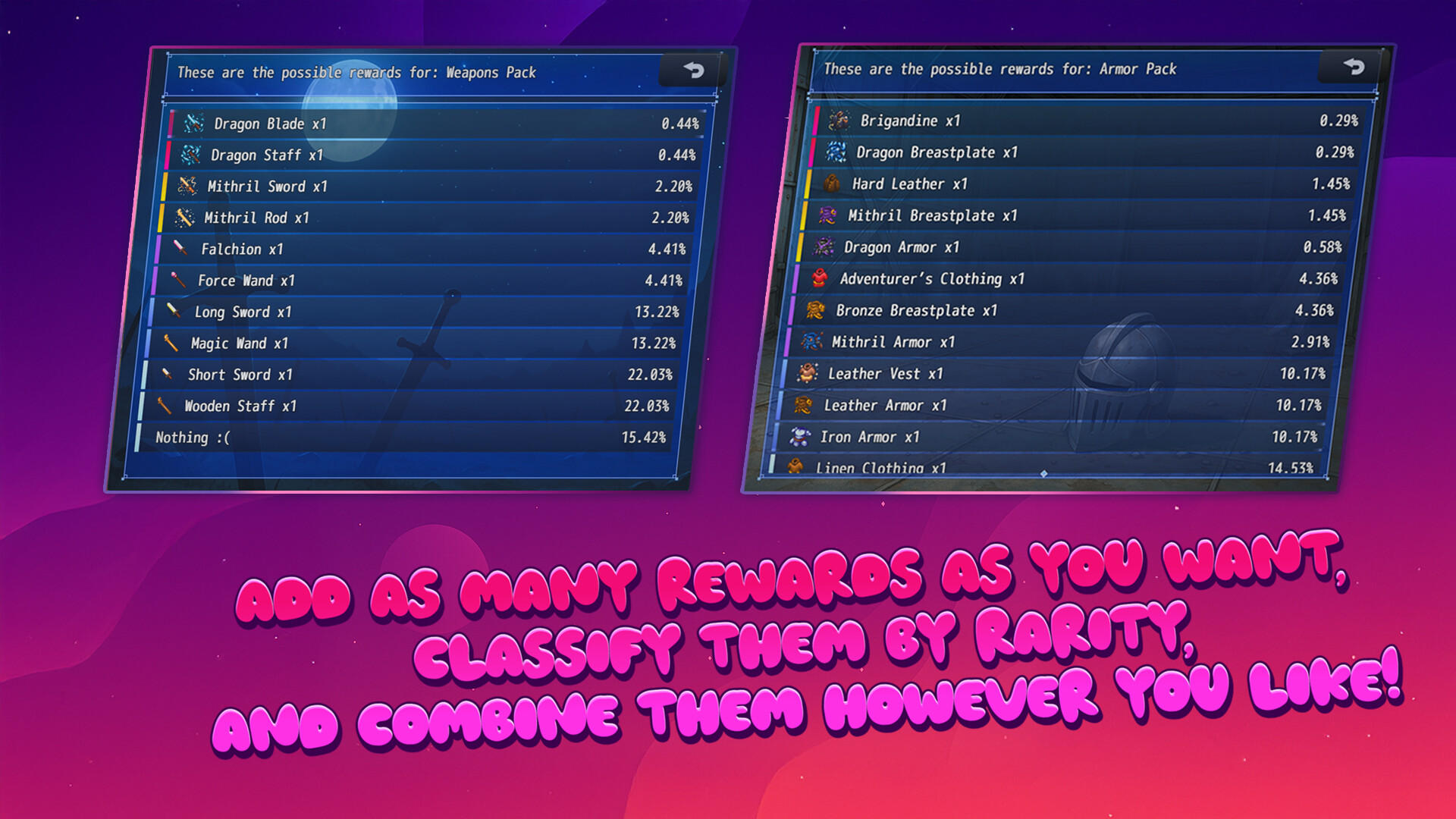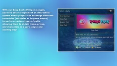 With our Easy Gacha System plugin, you’ll be able to enhance your game experience by adding a complete prize-drawing system! Players can spend in-game or premium currency to roll for random rewards, including items, equipment, or even characters. You can configure banners, drop rates, rarity tiers, guaranteed prizes, and much more, your imagination is the only limit!