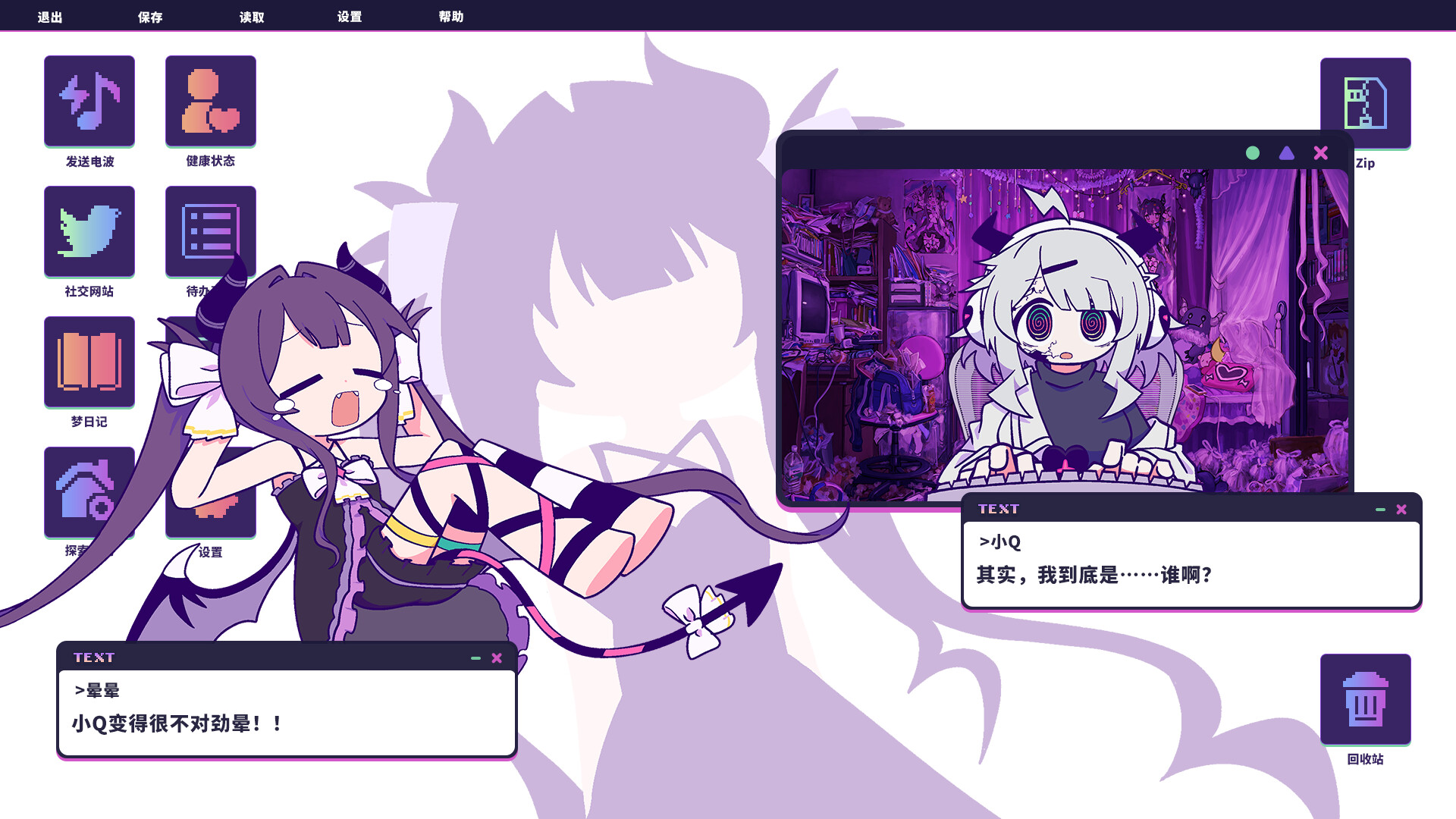 《晕晕电波症候群》是一款节奏冒险游戏。某个家里蹲少女吸食电波歌曲后上网激情输出萌萌怪文书,嗨翻天际的脑电波晃得整个世界晕头转向。