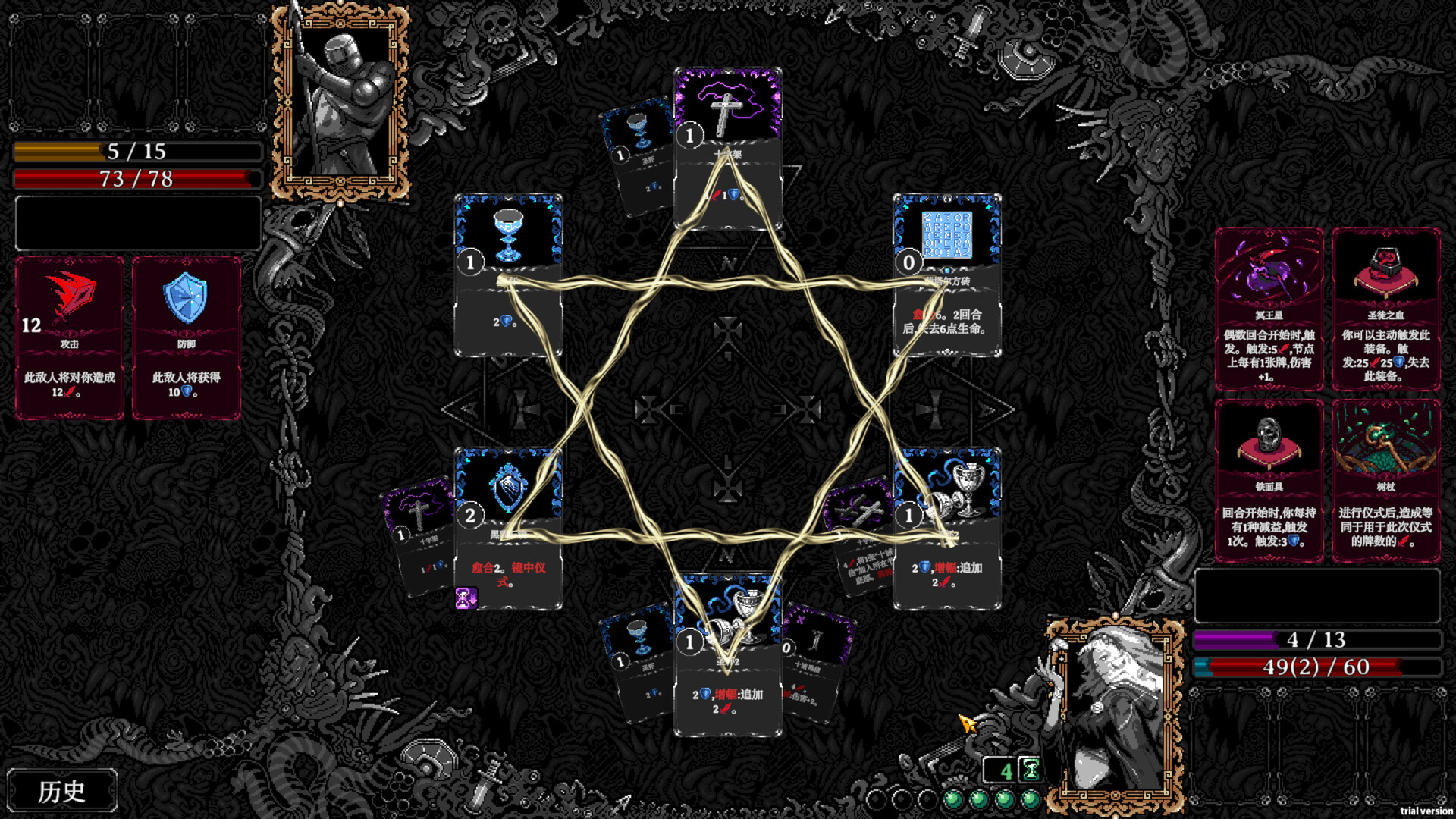 我们并不满足于只有单机模式,《恶魔召唤》的核心玩法非常适合作为一个竞技卡牌游戏。在PVP模式中,双方共用核心法阵,每个人的牌库分散在靠近自己的三个节点上,你和对手能够正常地将对方的卡牌用于仪式。这带来了其他卡牌对战游戏所难以企及的交互性,这也意味着同质化的对局在《恶魔召唤》中将不复存在。