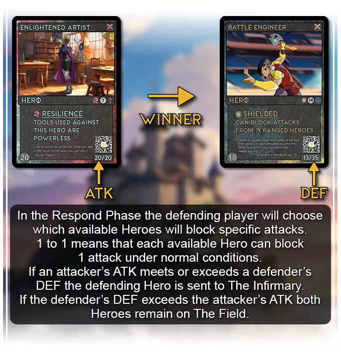 *Image Text: If an attacker's ATK meets or exceeds a defender's DEF the defending Hero is sent to the Infirmary. If the defender's DEF exceeds the attacker's ATK both Heroes remain on the field.