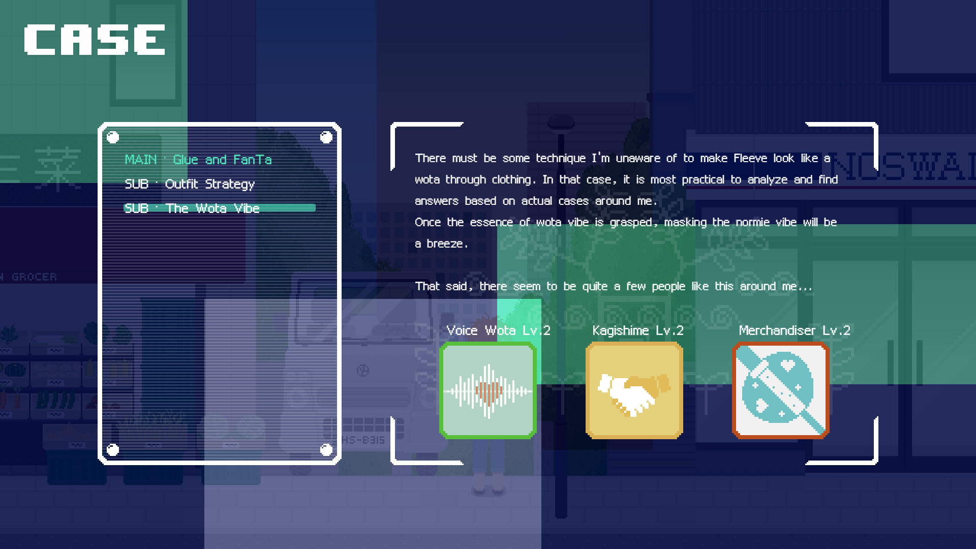 Play as an idol wota(otaku) and mystery novelist in this pixel world filled with various game memes and joyful daily life. Continuously improve your abilities and befriend wota friends with different attributes, working together to confront a conspiracy hidden within the idol wota world...