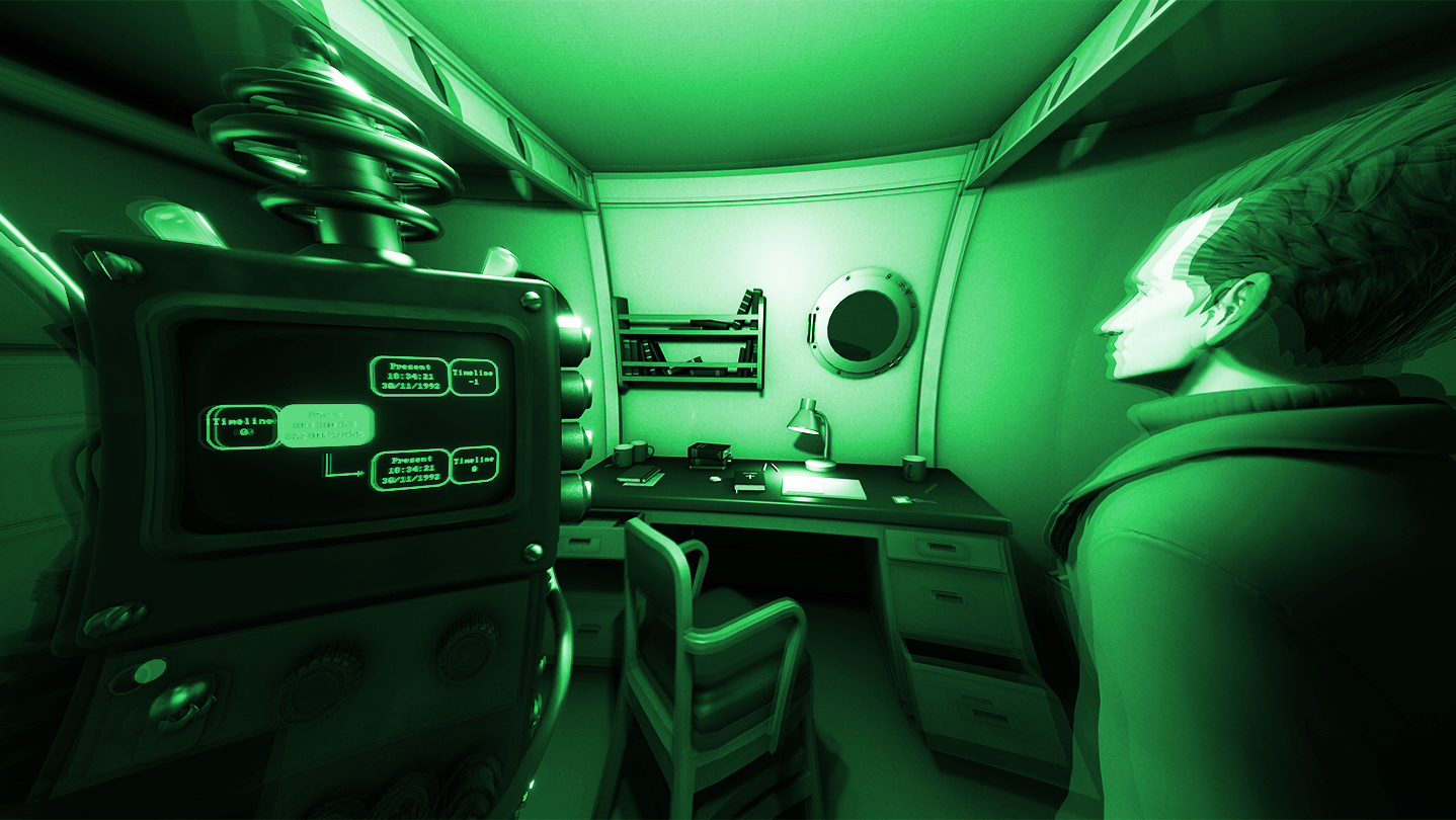 At Eternity's Hatch is a mystery puzzle adventure centred around an evolving time travel system. Stranded at sea aboard a 1950s research vessel in an alternate timeline, you must utilise the ship's time travel abilities to uncover information, solve puzzles across timelines and alter the past to return home. As the game progresses, you learn the rules governing the time travel system involving multiple timelines and how to use them to your advantage, unlocking new abilities along the way.