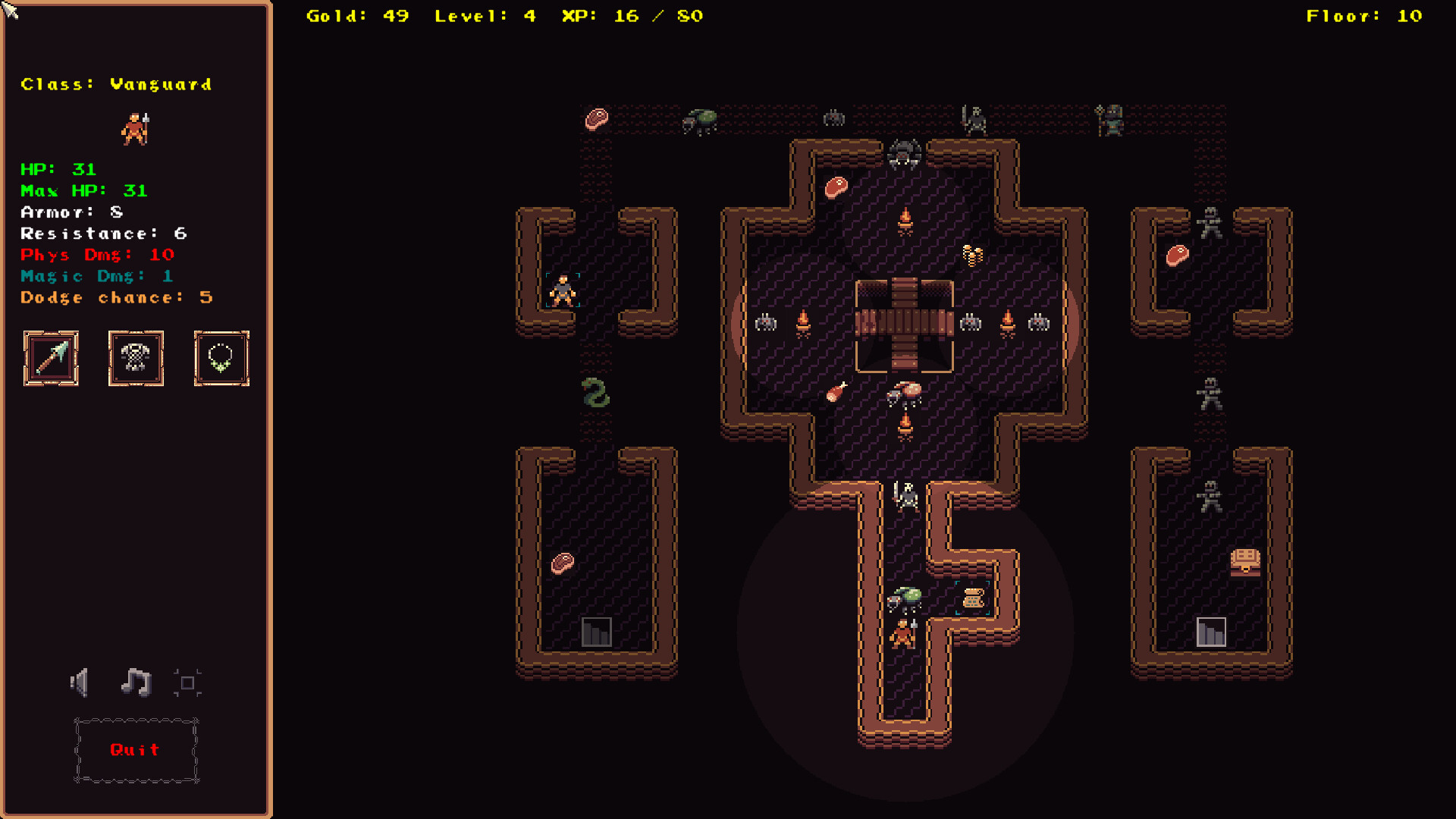 Descenda através de 20 andares randomizados entre uma variedade de 4 biomas. Planeje o seu caminho sabiamente, faça escolhas difíceis e recrute a ajuda de estrangeiros misteriosos que vagam na masmorra, onde cada um tem o seu propósito.  Algumas partidas acabarão em fracasso, mas sempre existirão mais heróis para assumir o lugar daquele caído.