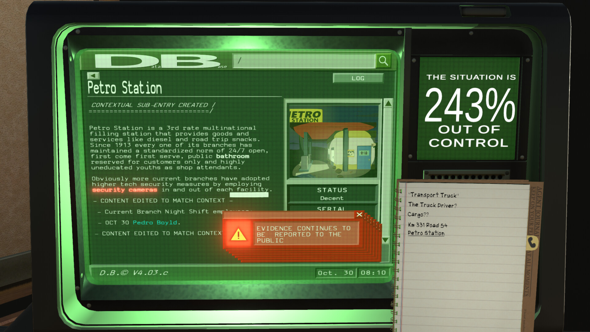 You are Agent, and it’s your job to decide how to deal with the evidence and witnesses of an undesirable event. Do it well and on time, or you’re fired. All from the safety of your desk.
