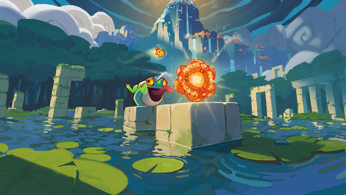 Each level is a compact diorama of ruins, blocks, fruit, and ancient artifacts - simple at first glance, but full of clever twists. Your goal: help your frog collect the Shiny Artifact! Rotate the scene to discover new paths, challenge your 3D spatial awareness, and transport Frogblocks to create your own paths!