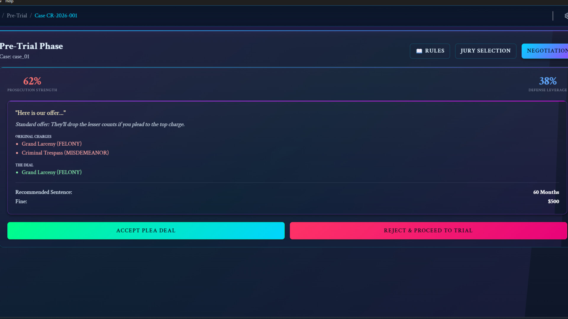 Early Access is our chance to rebuild the foundation. Right now the core loop, trial flow, plea negotiations, and client interactions all need significant repair, and we expect to spend most of this phase stabilizing those systems, tightening UX, and clearing the major bugs players uncover. Once that backbone feels reliable, we’ll apply what we learn to rebalance pacing, improve onboarding, and layer in polish. The exact mix of fixes and additions will follow community feedback, and we’ll only lock the 1.0 scope after we see what needs the most attention.