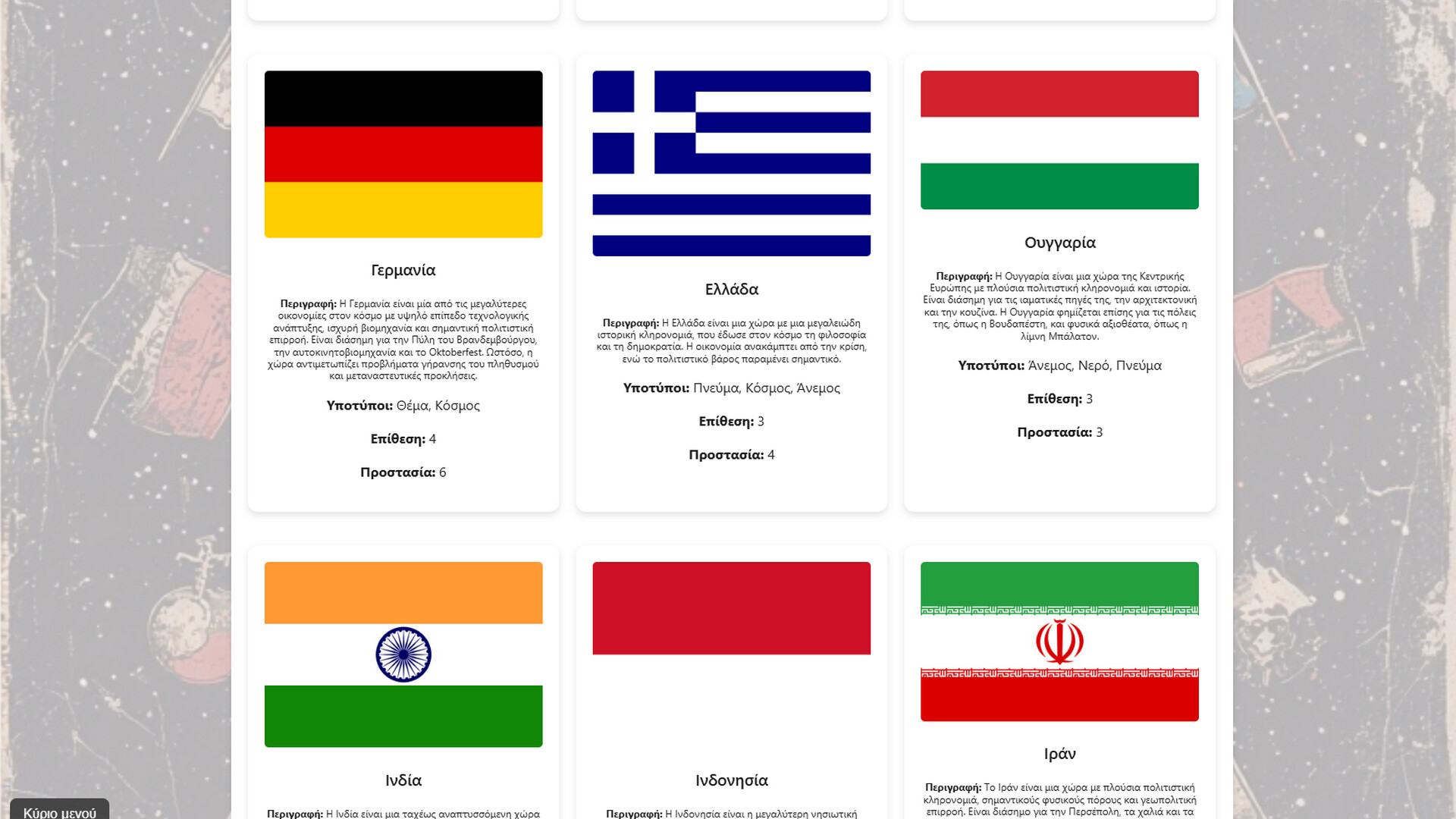 Το GLOBAL CONTROL COUNTRIES είναι ένας στρατηγικός προσομοιωτής καρτών και μια μικρή εγκυκλοπαίδεια για διεθνείς διαχειριστές. Υποστήριξη σε 37 γλώσσες. Εκπαιδευτικό αποτέλεσμα και συναρπαστική δράση με μοναδική μηχανική παιχνιδιού. Μην φοβάσαι την πολυπλοκότητα – το παιχνίδι μοιάζει περισσότερο με το Blackjack παρά με το Πόκερ!