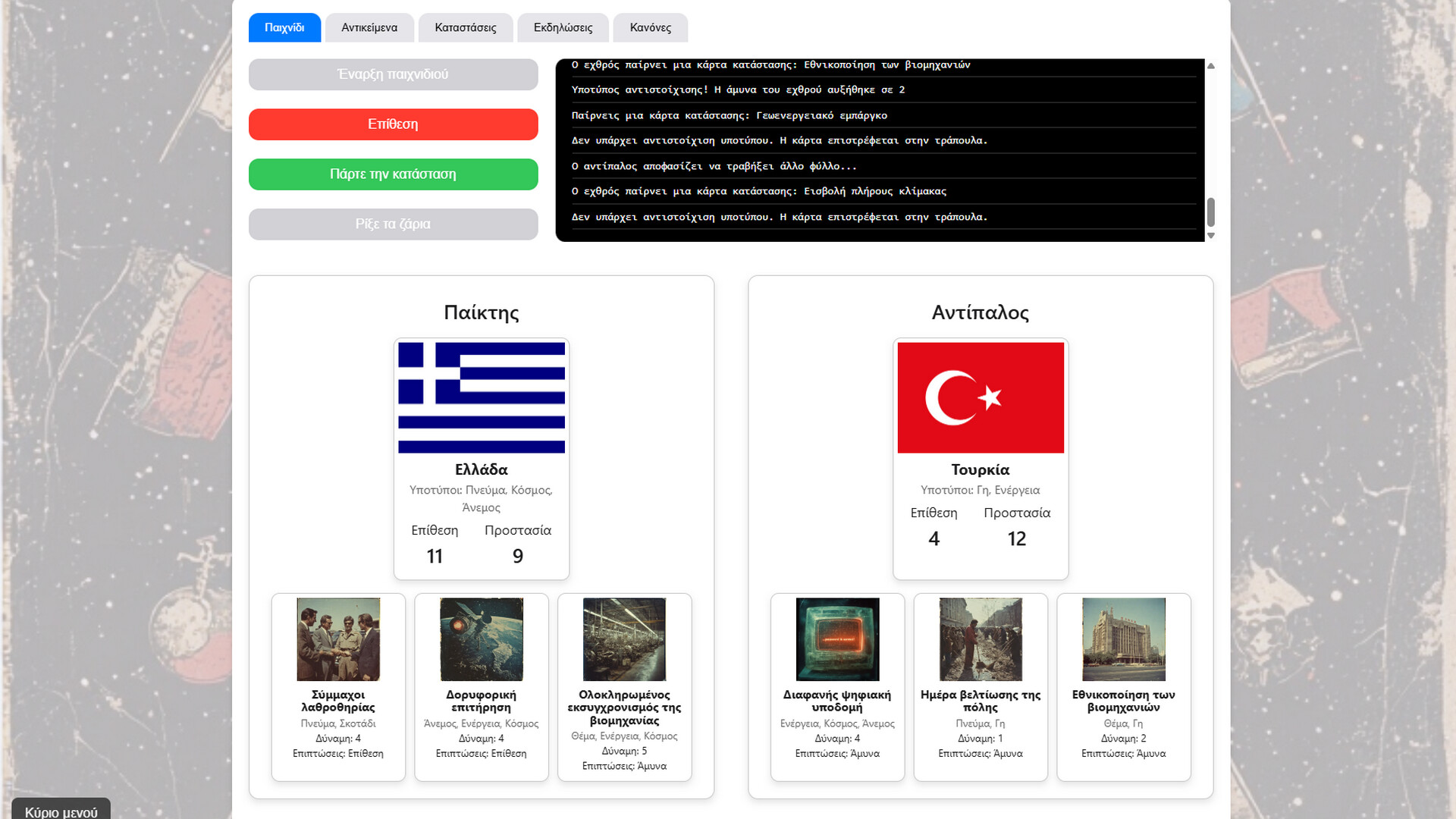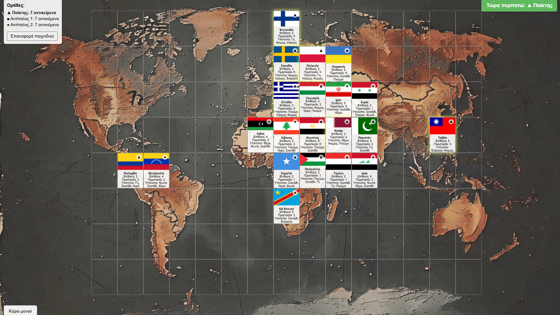• Αγώνες συμμαχιών καρτών σε έναν διαδραστικό γεωγραφικό χάρτη για παγκόσμια κυριαρχία