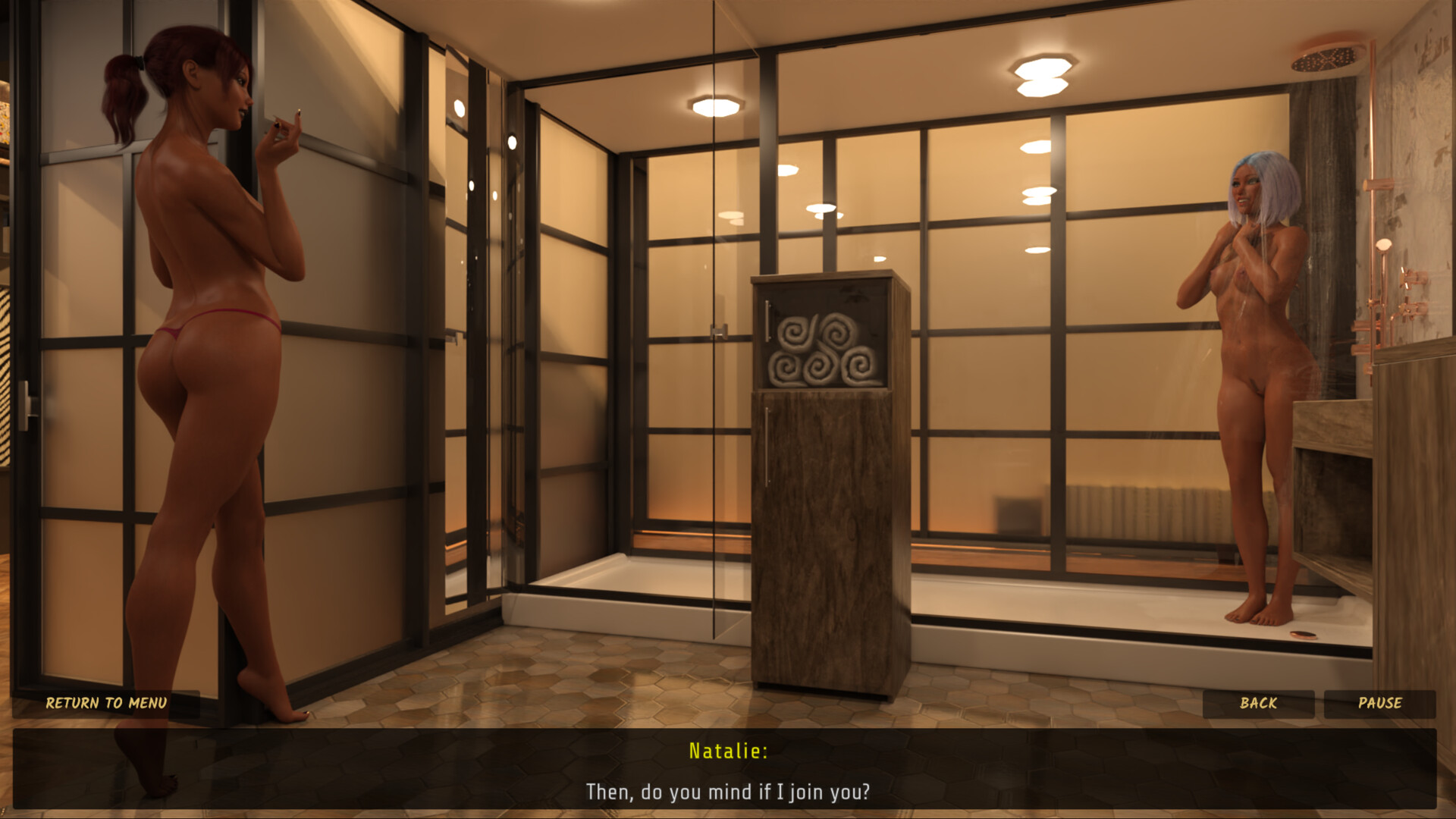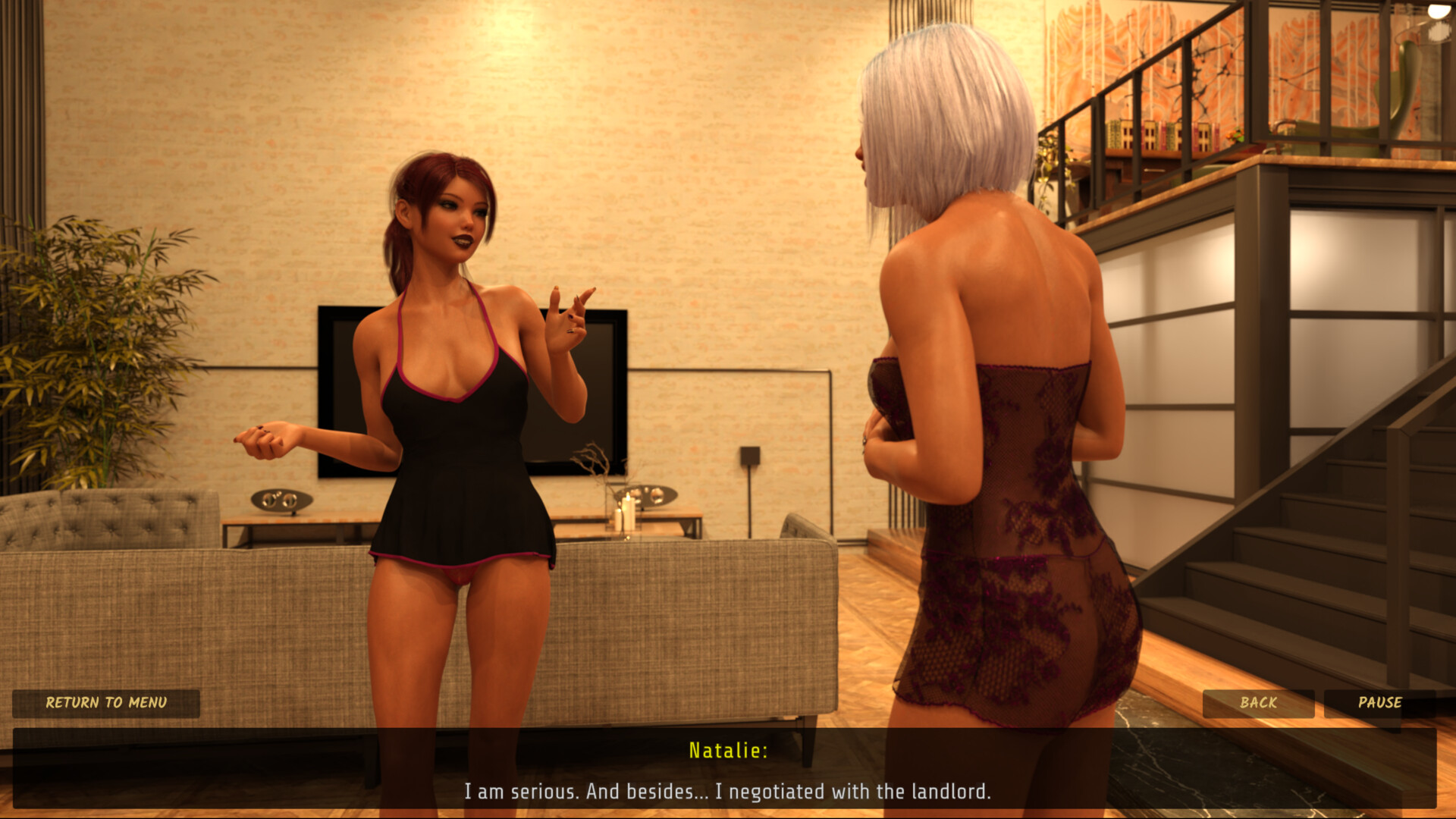Enjoy an erotic visual novel featuring two hot women and an engaging sex simulator. Juliette and Natalie spend a cozy evening in their amazing loft. The warm atmosphere and sexy clothing quickly heats up the night and the girls end up having fun and sex all around the house.
