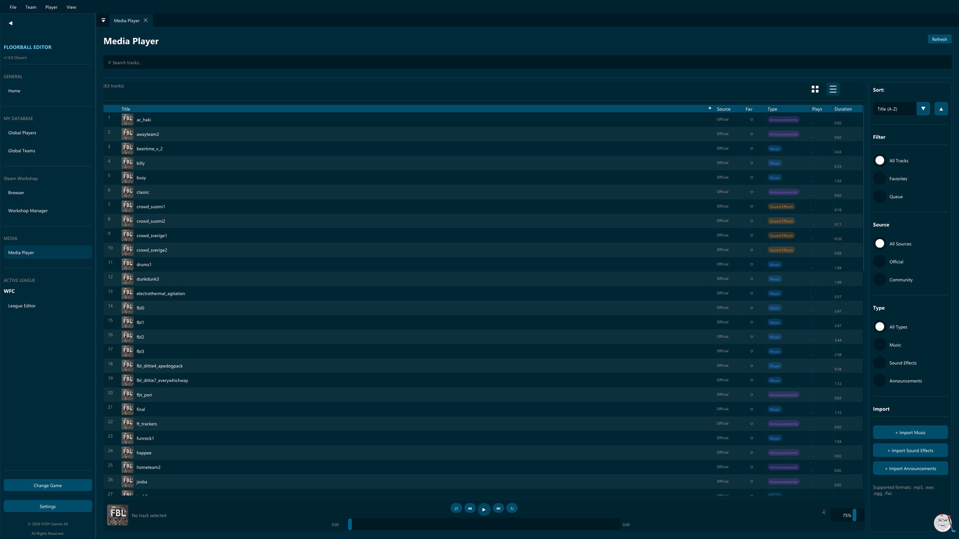 Floorball Editor (formerly “FBL Editor”) is the modern, rebuilt editor for Floorball League 2010. It lets you create and manage custom players, teams, and competitions, and share them with the community, without requiring any update to Floorball League 2010.