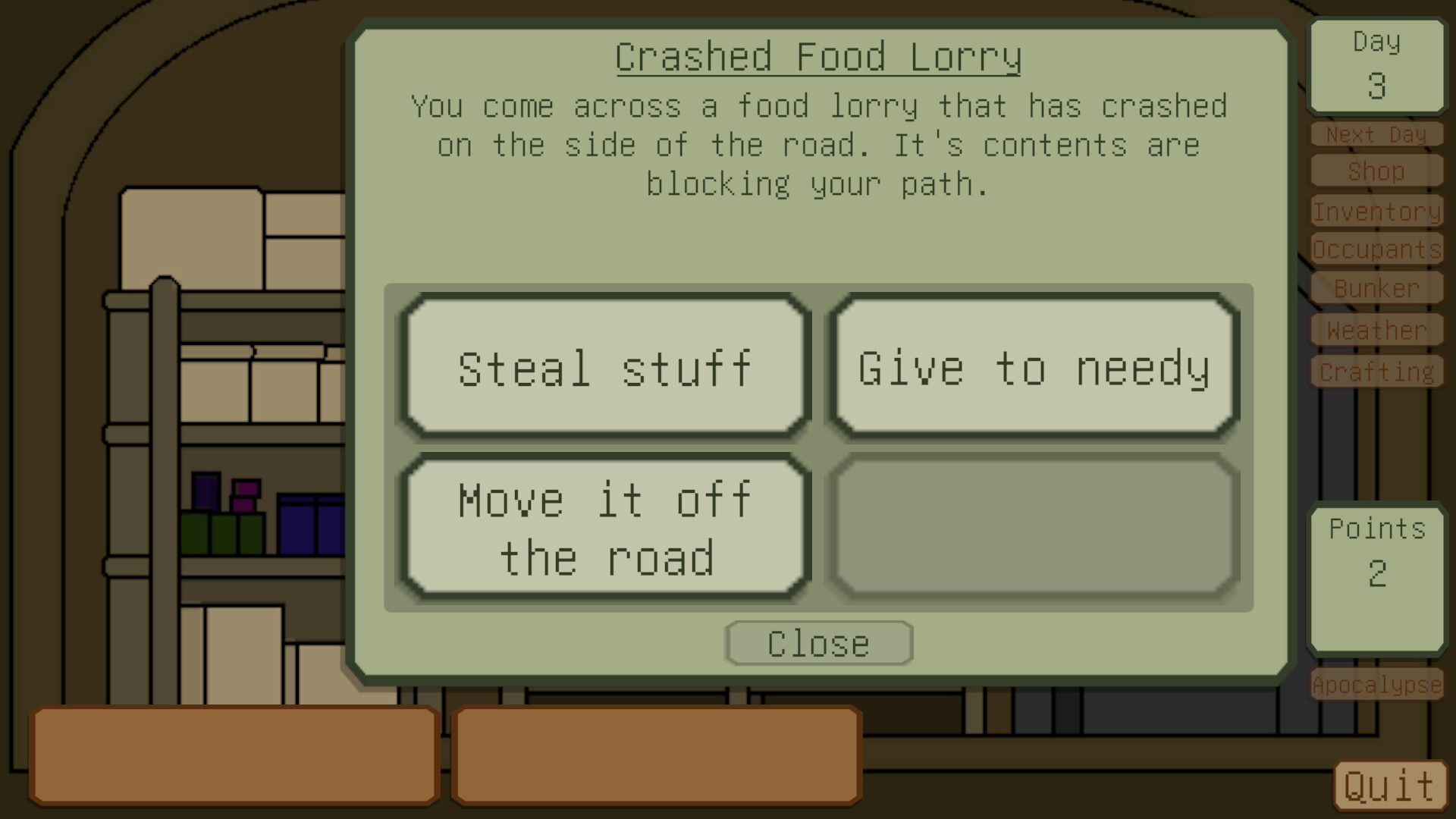 The Prepper is a turn-based survival management game where you manage a bunker, ration supplies, and make tough choices to keep your survivors alive through a collapsing world. Every decision matters—how long can you survive?
