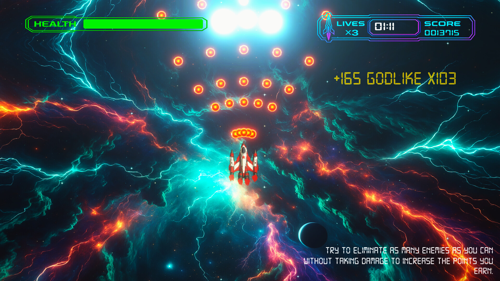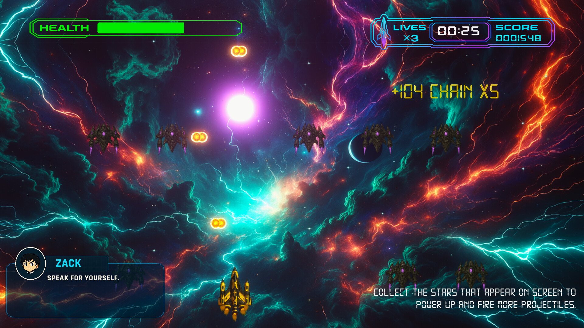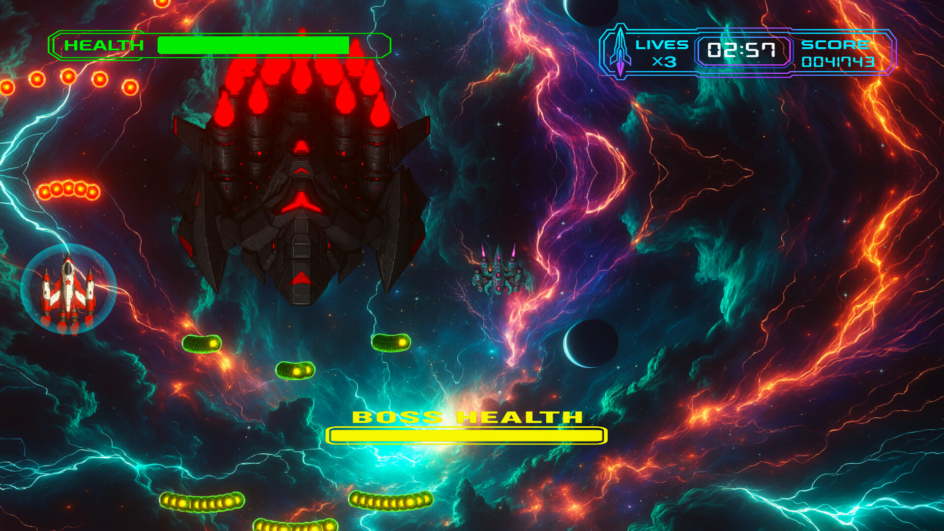 Precision bullet-hell shmup with dual-element weapons, two tight-window shields, reactive in-mission dialogue and multi-phase bosses. Lead three rival aces united against the theocracy of Zael Aether.