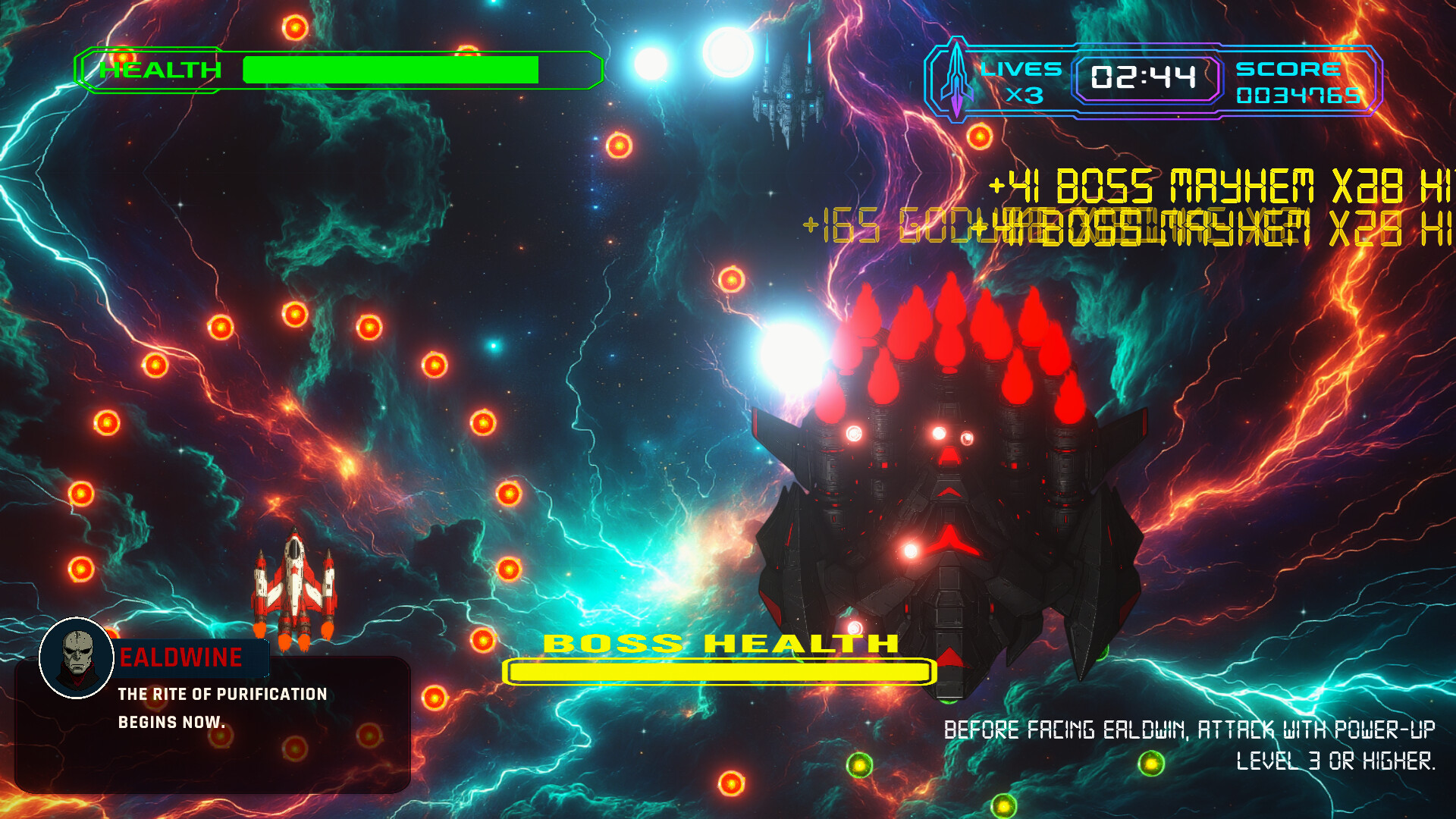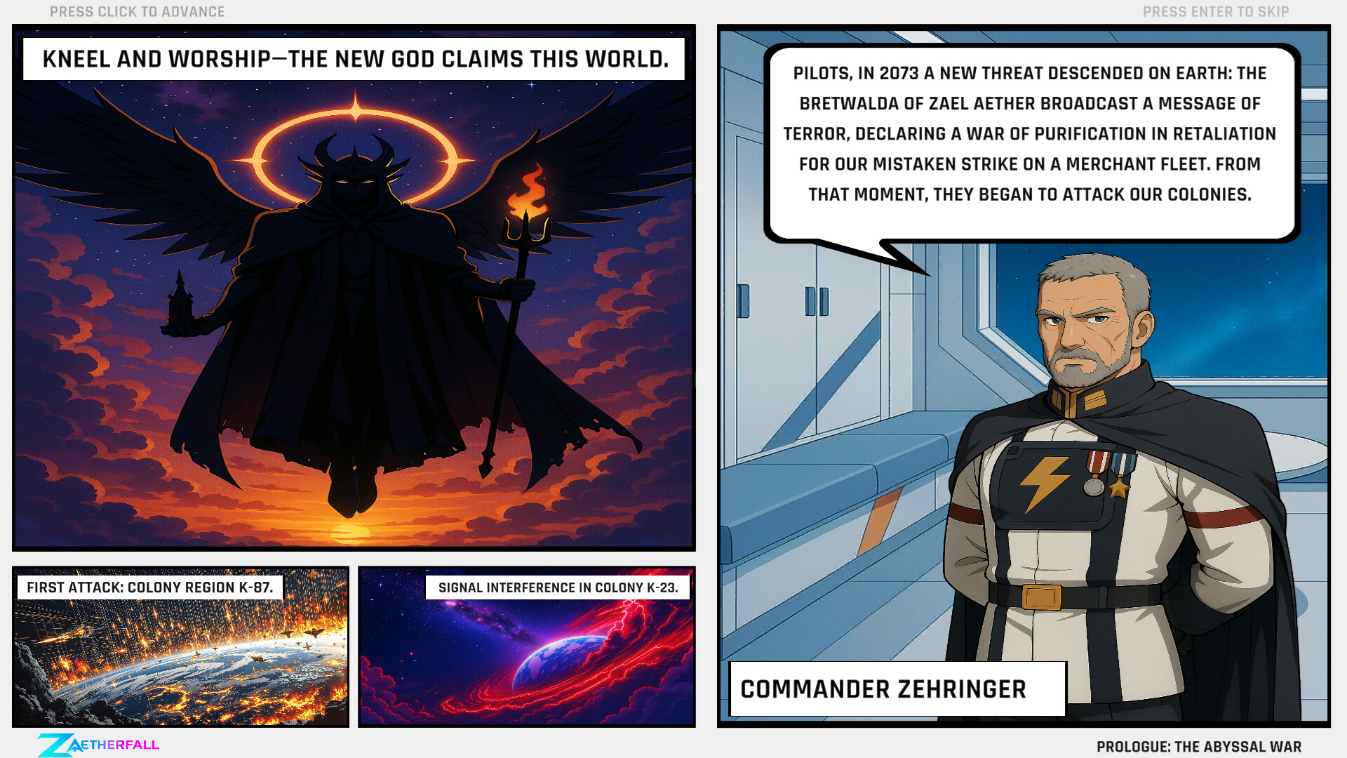 Precision bullet-hell shmup with dual-element weapons, two tight-window shields, reactive in-mission dialogue and multi-phase bosses. Lead three rival aces united against the theocracy of Zael Aether.