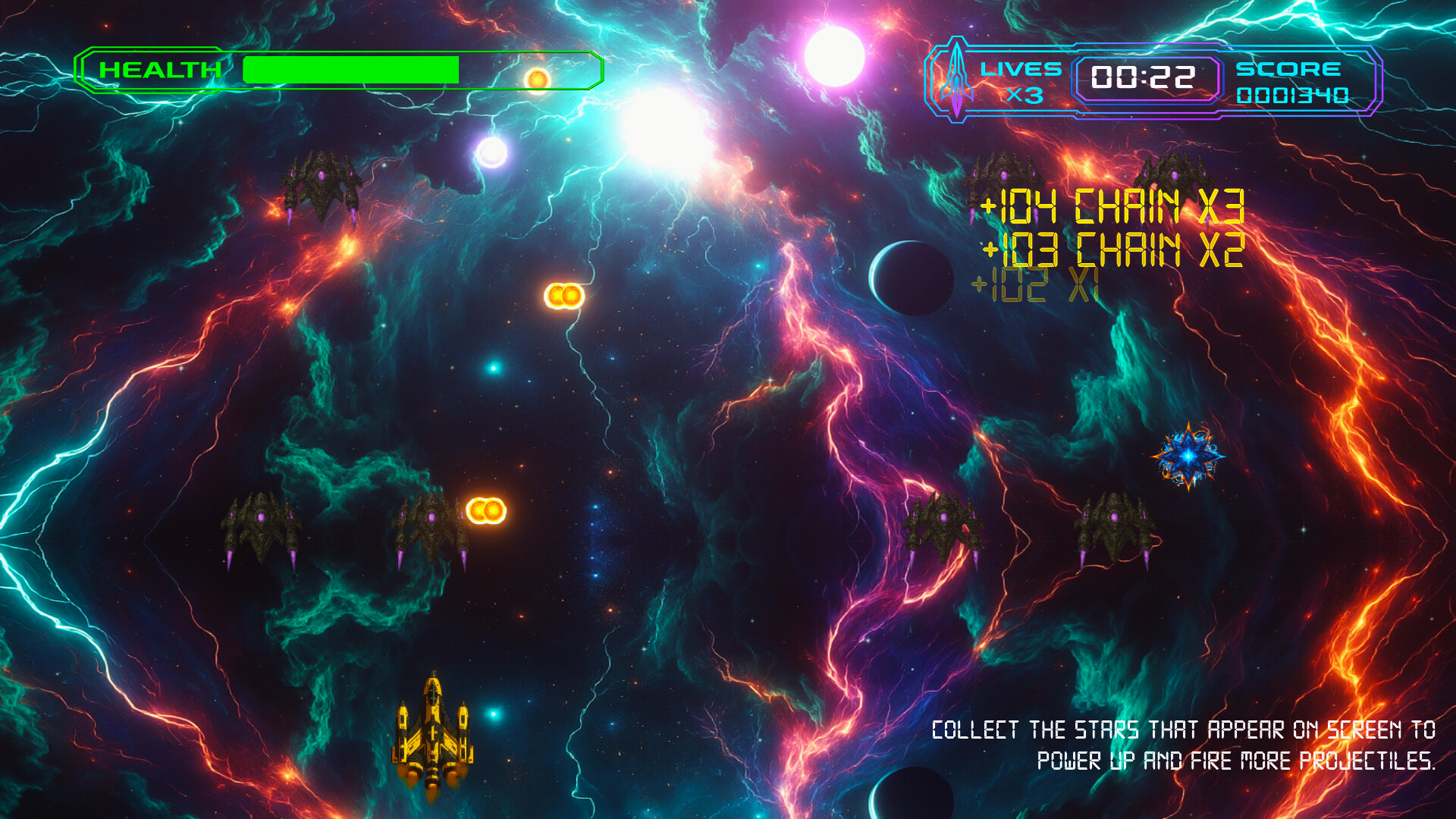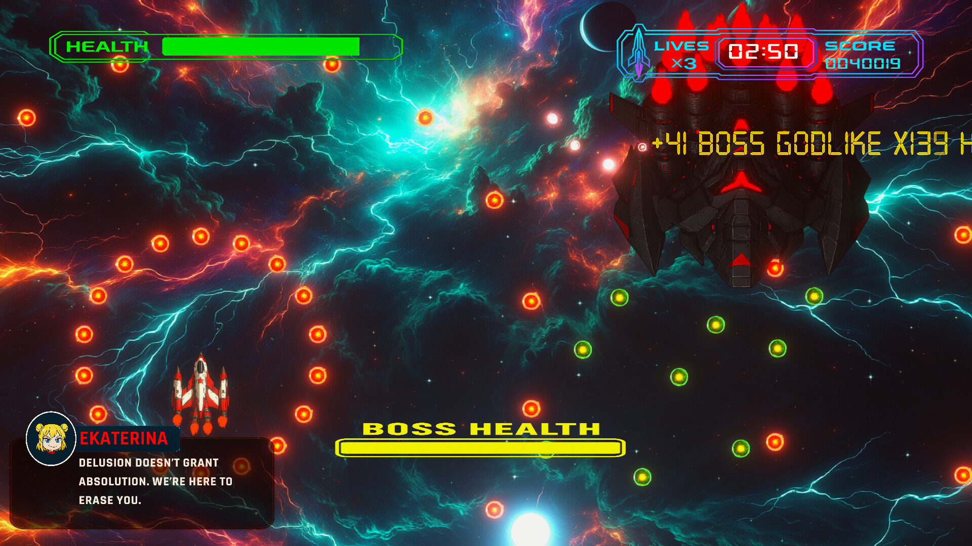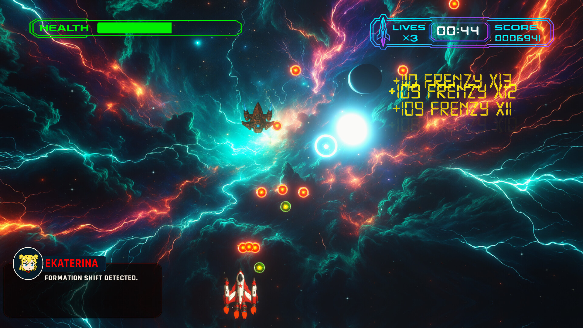 Evolving commanders – Multi-phase bosses with intentional formations and curtain fire.