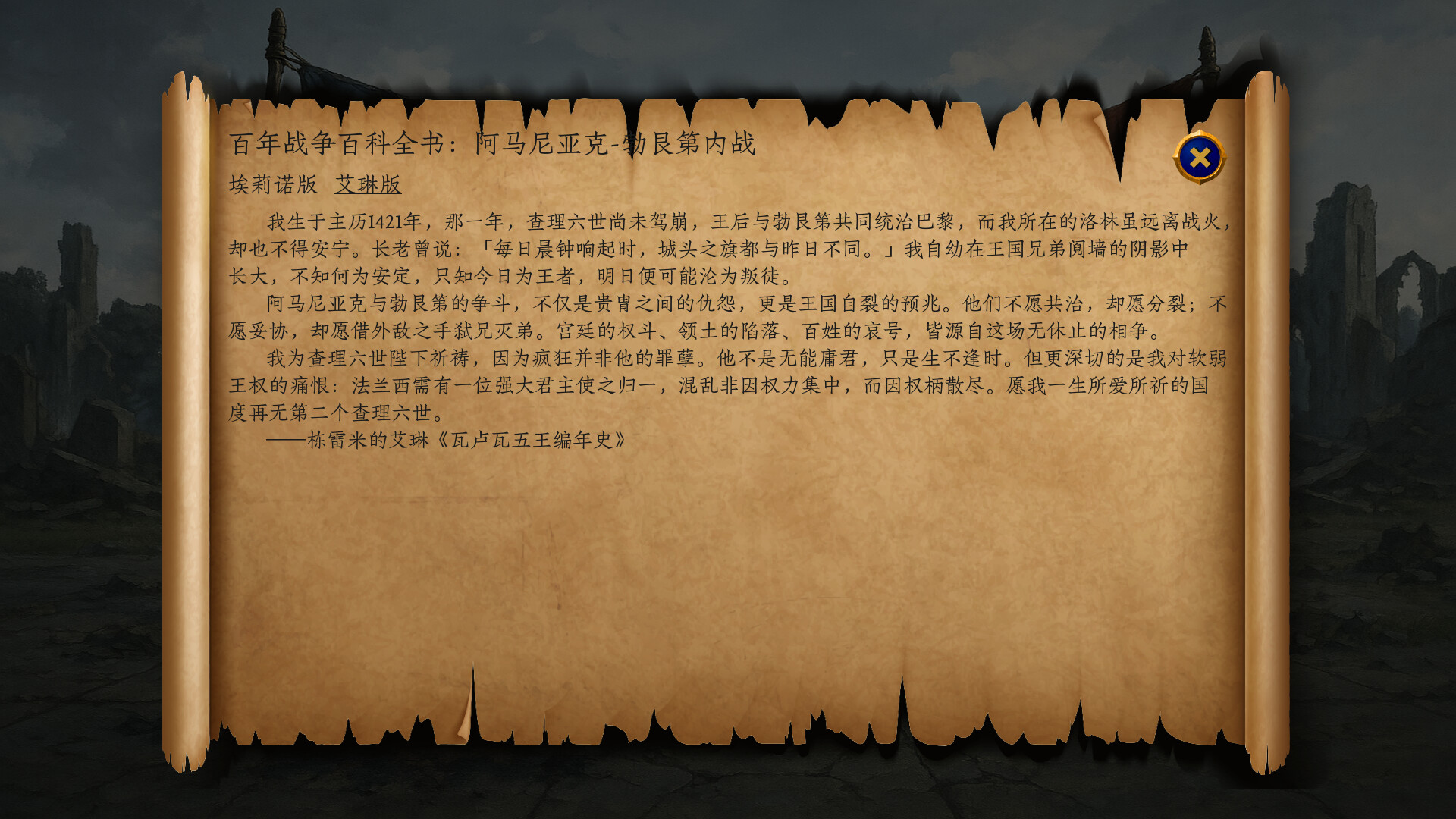 在百年战争的硝烟中,既有策马驰骋、决定胜负的英雄人物,也有见证一切、记录一切的她们——《烈火与王冠》的百科系统并非冰冷的设定集,而是一套由两位女性史家共同书写的“非中立史书”。