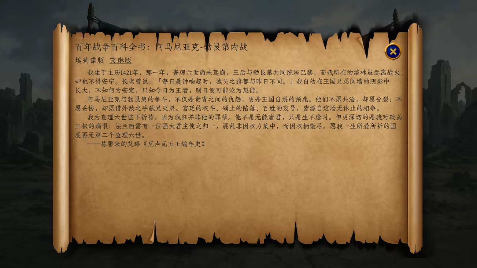 • 身临其境的中世纪史诗:横跨 1413年–1434年,史实背景与架空细节有机结合,涵盖阿金库尔战役奥尔良之围鲁昂审判巴黎夺还战,深入还原动荡不安的百年战争时代。