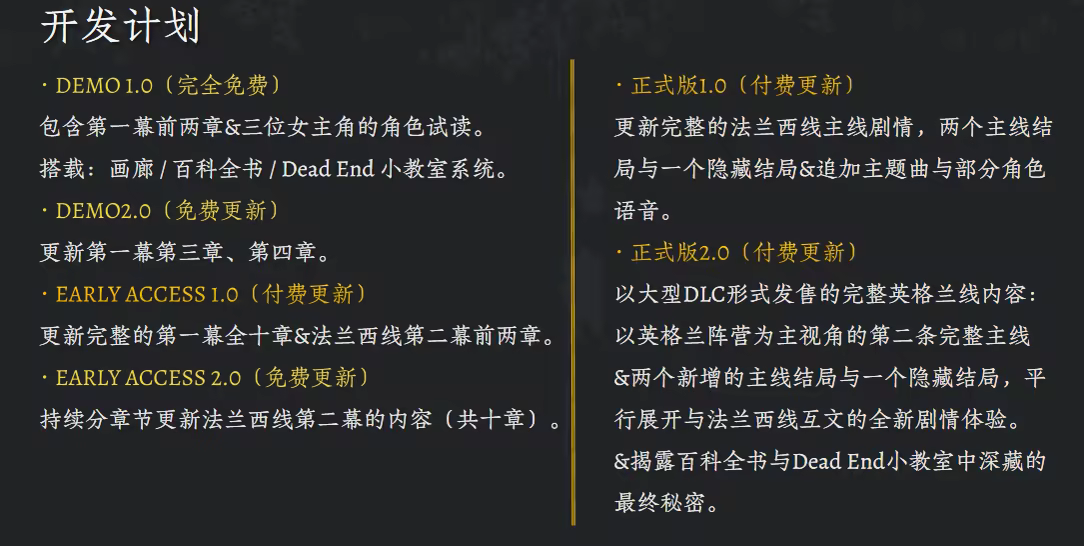 “抢先体验版本包含完整的共通线第一幕,并且会不断地免费更新法兰西线第二幕的内容。