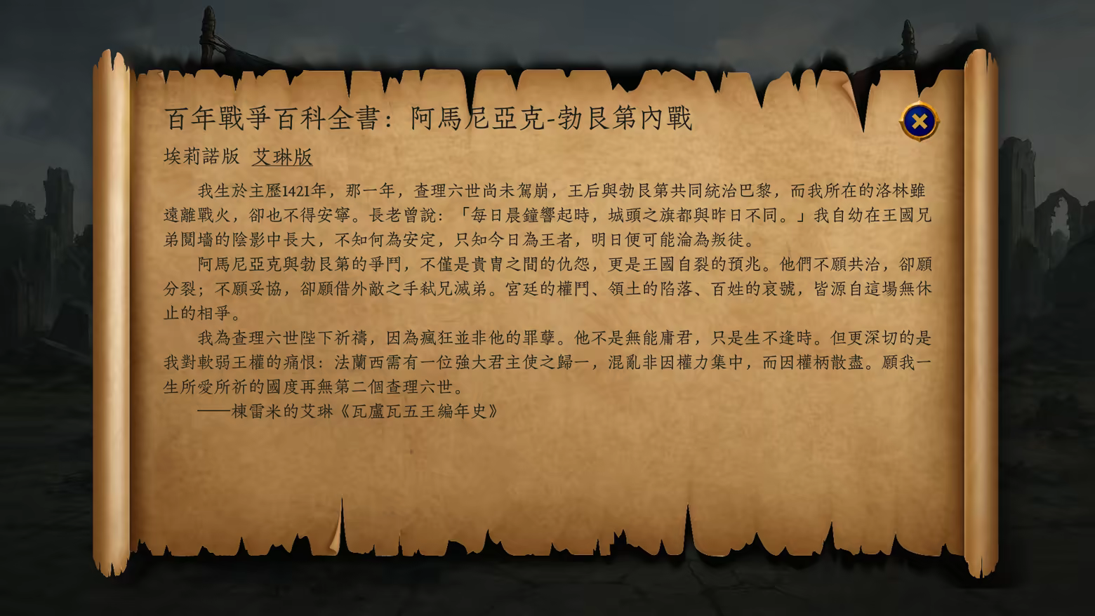 在百年戰爭的硝煙中,既有策馬馳聘、決定勝負的英雄人物,也有見證一切、記錄一切的她們——《烈火與王冠》的百科係統並非冰冷的設定集,而是一套由兩位女性史家共同書寫的“非中立史書”。