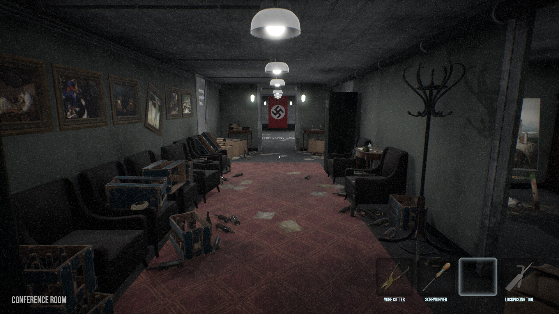 Bunker 1945 is a first-person puzzle adventure set in a historically inspired World War II bunker. Players explore and interact with their surroundings, solve intricate puzzles, engage in tense conversations with staff, and use stealth to avoid enemy patrols - all to capture the world's most evil man.