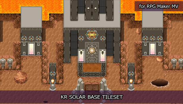Give your heroes a magitech base to visit when they need to gather even more power to defeat the demon king with the KR Solar Base Tileset! Kokoro Reflections is here with a mirror to their lunar base set, this time offering us a MV-sized tileset that has warmer tones and some burning hot lava. Build a space station located on a planet much too close to a star, or leave an ancient temple deep in a volcano for your heroes to find that gives them new and powerful equipment to take on any challenge.