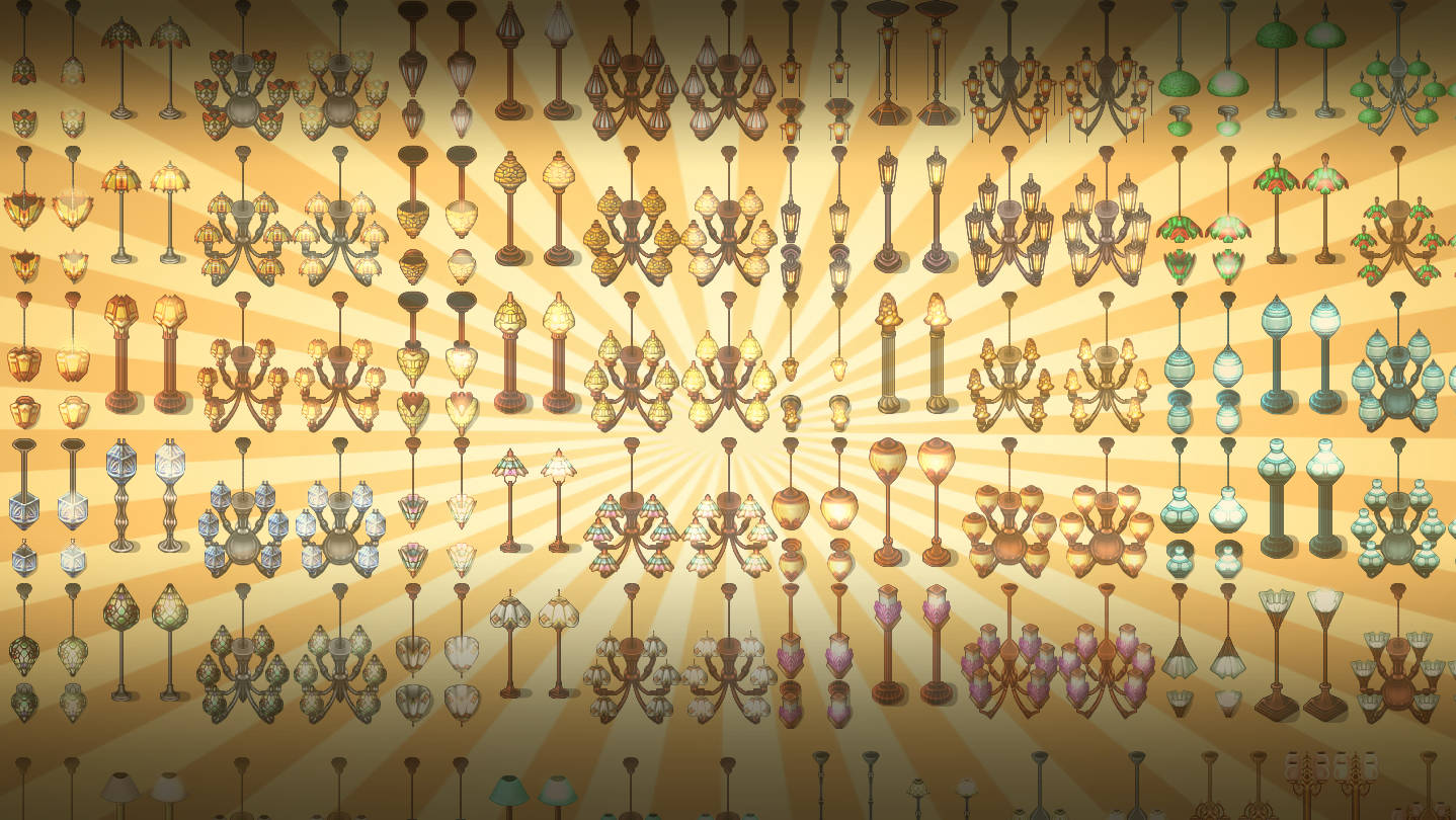 6 B sheets are filled with a rainbow of options, each with their own style. Give your art deco-loving NPC a chandelier with sharp angles, while a younger NPC sticks to a few floor lamps with simple beige lampshades to light their apartment. Decorate a gothic home with dark lantern-shaped scones and fill an eccentric NPC’s home with mismatched stained glass lamps. Each light comes in two versions (unlit and lit), so you can make sure that your players can fully appreciate the lamps no matter if it’s day or night. Have the lights automatically turn on based on the in-game time system to gently remind your players that they should rest for the night, or add a puzzle to a mysterious mansion where your players need to turn on and off all the lights in the house in a specific order. If you have been wanting to replace all the torches and default lights in your game with some great lamps, check out the KR Furniture Store - Lamps and Lighting pack!