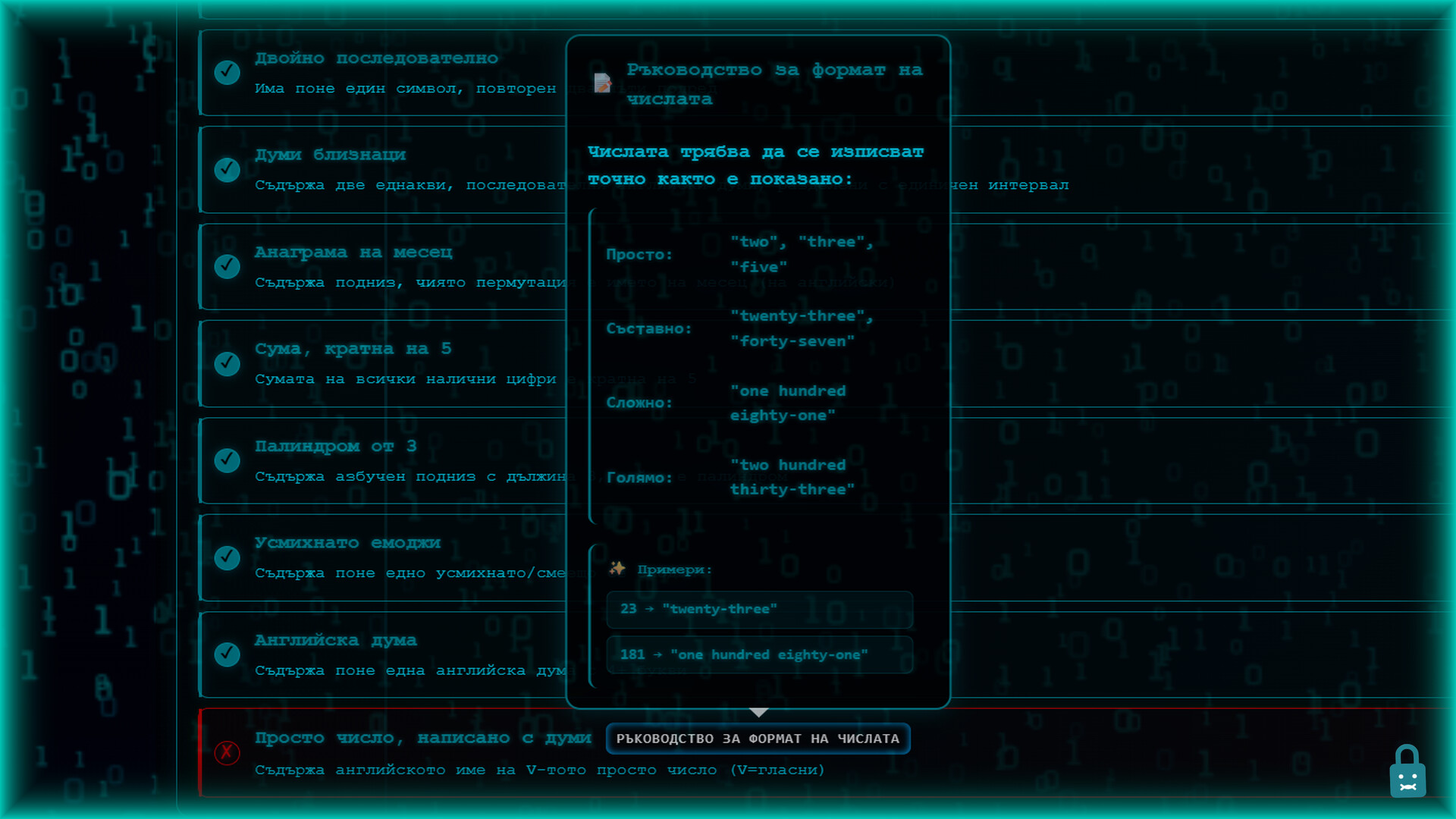 Решавайте предизвикателни текстови пъзели с пароли през 40 нива, използвайки логика, разсъждения и допълнителни външни инструменти. Вашите правила, вашата игра: бъдете първият, който я оформи за другите!