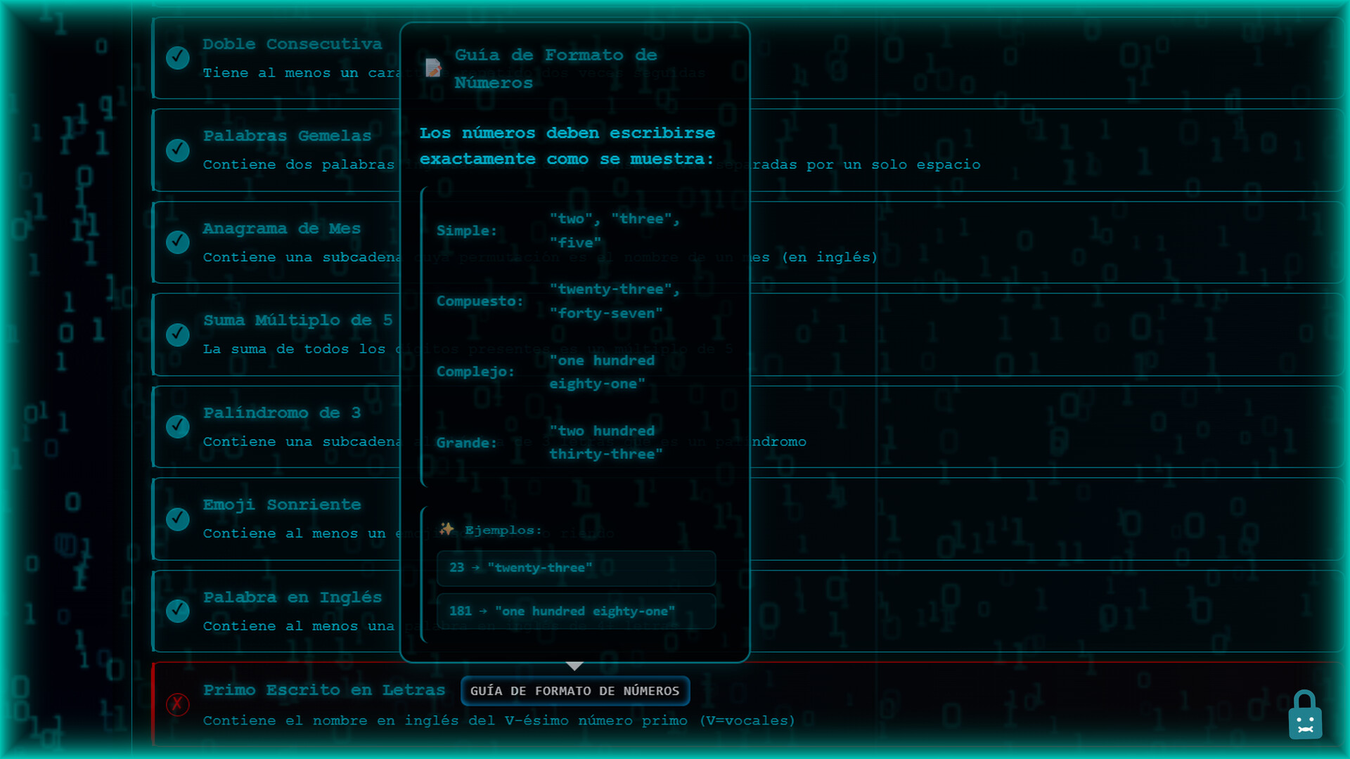 Resuelve desafiantes rompecabezas de contraseñas basados en texto a través de 40 niveles, usando lógica, razonamiento y herramientas externas opcionales. Añade nuevas reglas después de completar todos los niveles. Tus reglas, tu juego: ¡sé el primero en moldearlo para otros!