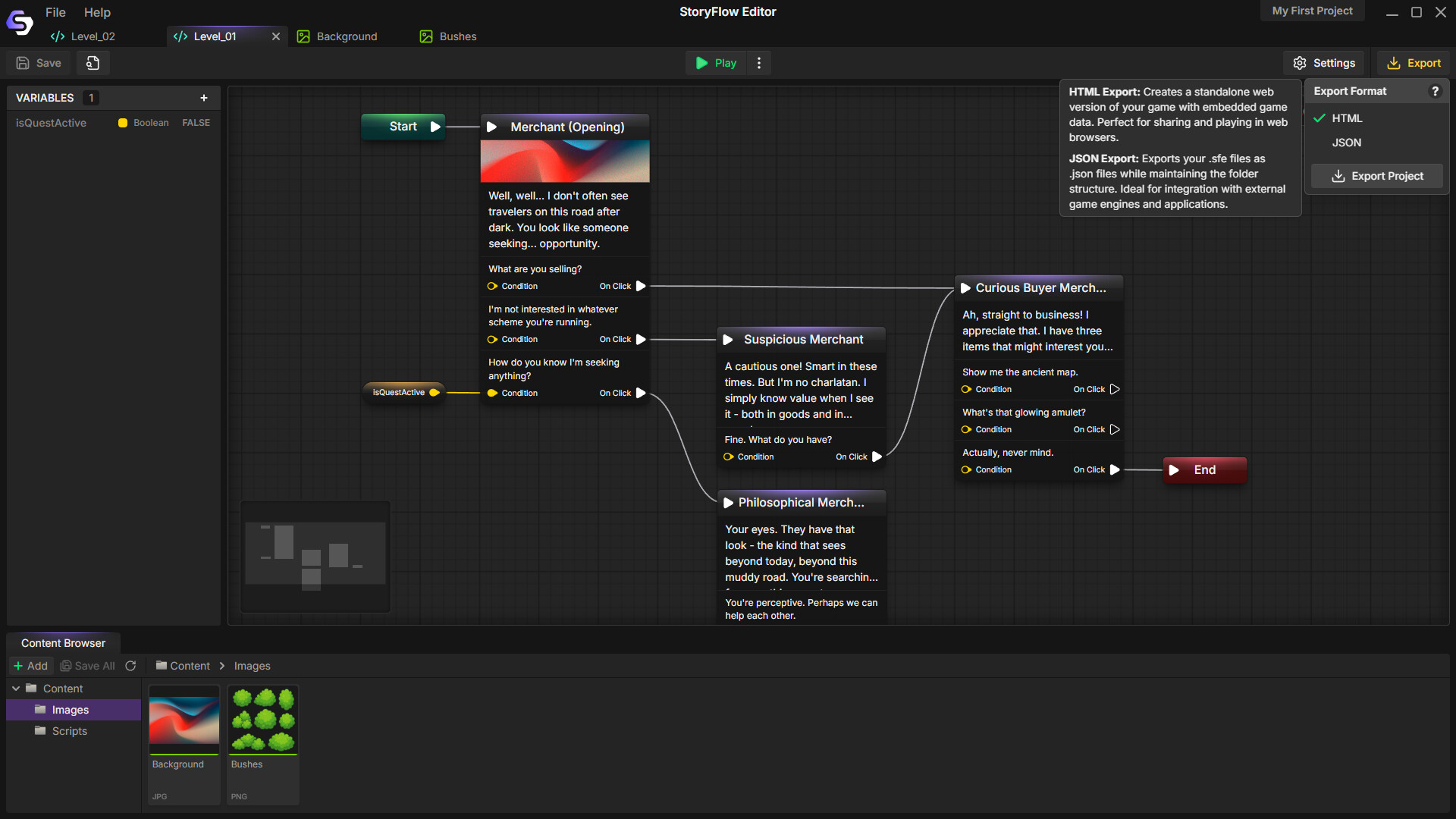 Create complex story structures, branching dialogues, and conditional logic using an intuitive visual interface - no coding required. See your entire narrative at a glance, test different paths, and export as standalone HTML or JSON (can be used with game engines).