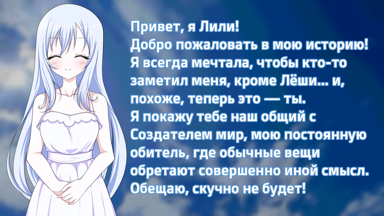 В этой визуальной новелле главный герой — программист по имени Алексей, чья жизнь утопает в серой рутине одиночества. Устав от бесконечного однообразия, он создаёт в воображении идеальную девушку Лили и погружается с ней в иллюзорный мир санатория. Но со временем фантазии выходят за рамки лёгких грёз, стирая границы между реальностью и иллюзиями.