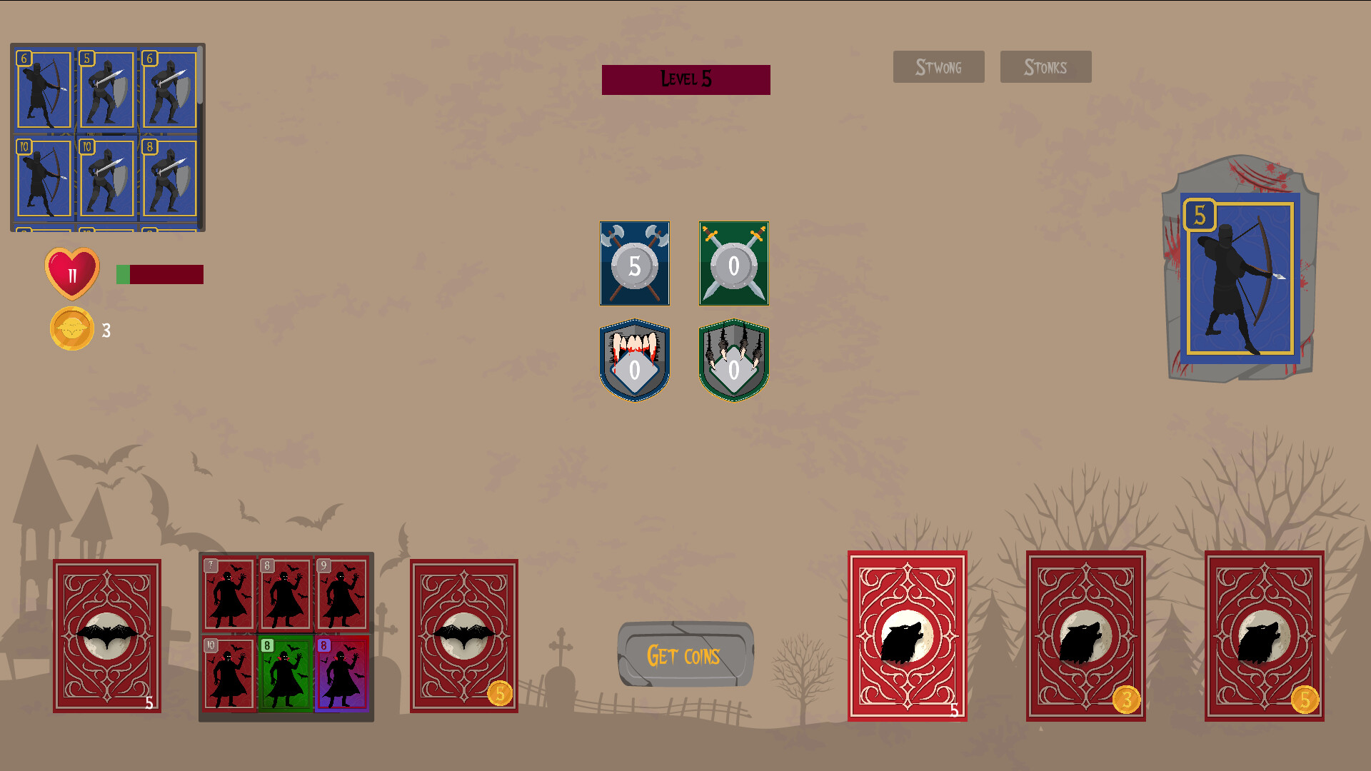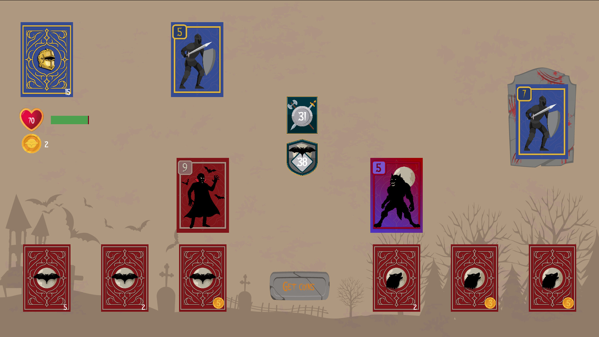 Unite the strength of the Vampires and the Werewolves and combine their defenses in a unlikely alliance to defend from the humans. Select your moves between playing cards, earning coins or unlocking stronger decks to survive their rampage. Choose your desired rewards and build unique decks!