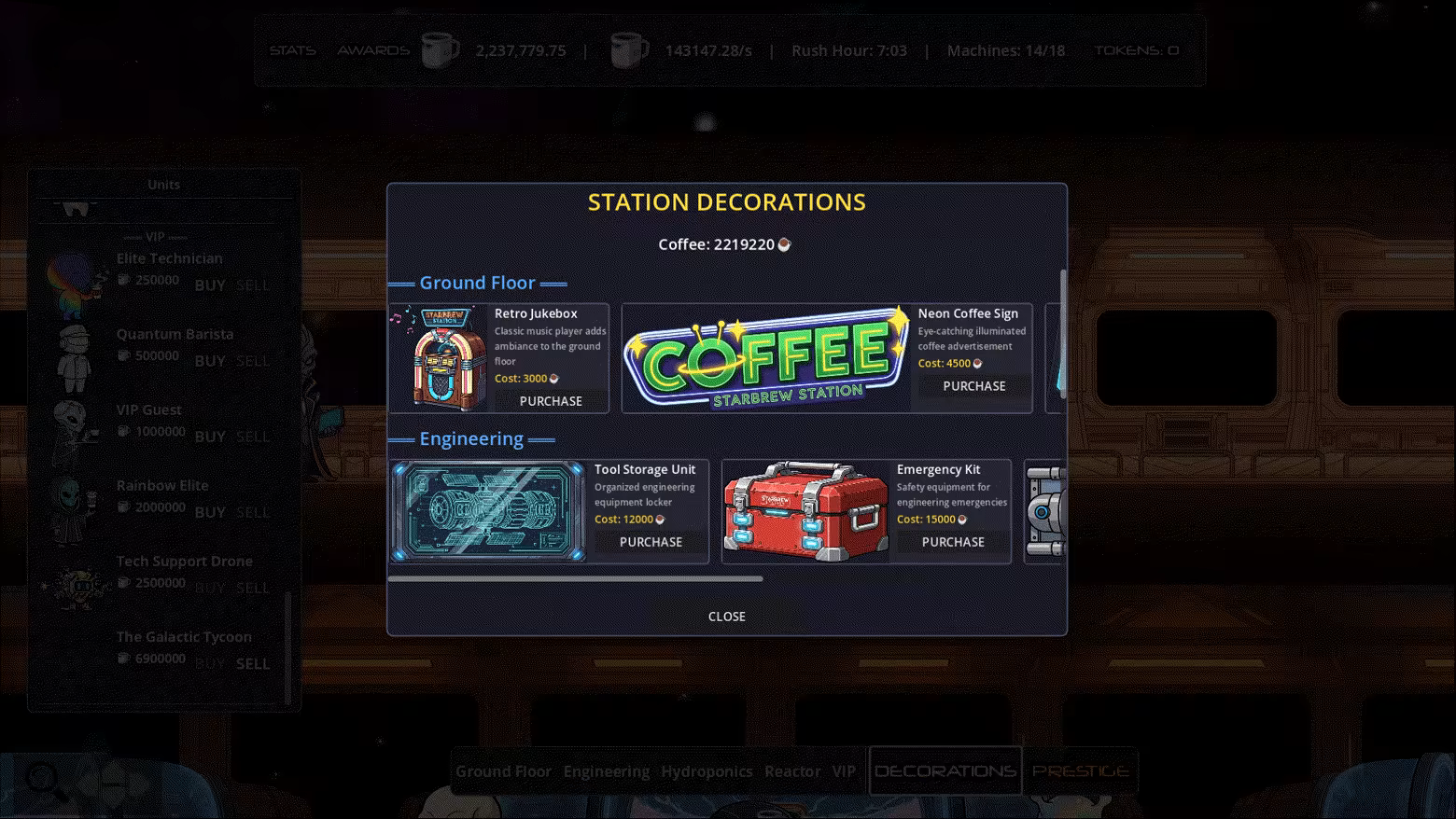 Expérience juste et complète : Starbrew Station est un free-to-play conçu pour être terminé sans dépenser d'argent. Pour les joueurs qui souhaitent soutenir le développement, nous proposons une sélection de DLC purement cosmétiques et optionnels, ainsi que quelques unités de jeu équilibrées.