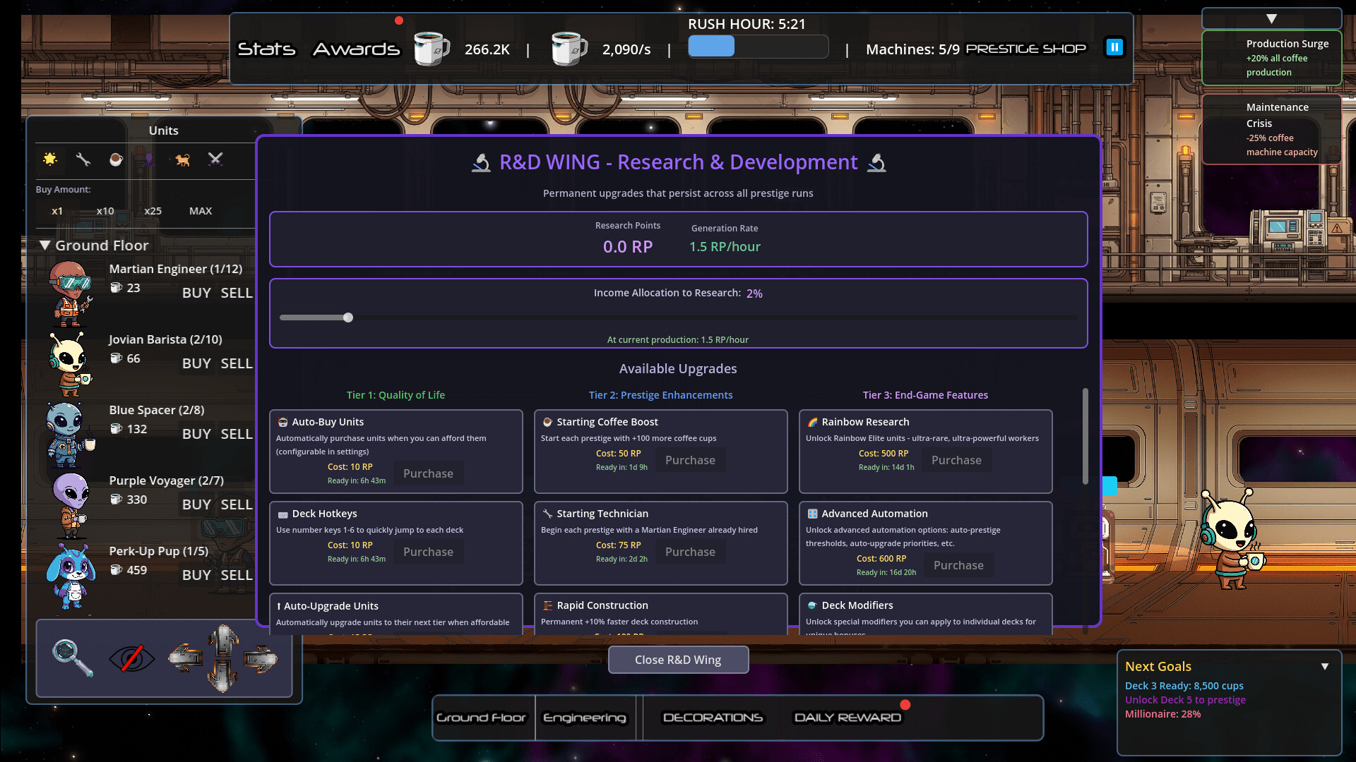 Rozwijaj swoją działalność na 6 zróżnicowanych wizualnie pokładach, od przemysłowego pokładu maszynowego, przez bujny ogród hydroponiczny i nowoczesny poziom reaktora, aż po ekskluzywny salon VIP i pokład administracyjny. Każdy nowy pokład odblokowuje potężniejsze jednostki i zwiększa produkcję całej stacji!