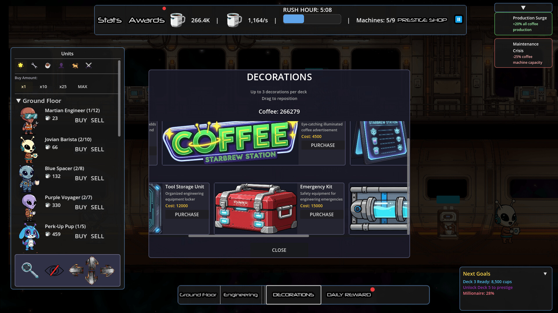 Gestionează o cafenea spațială aglomerată în acest joc idle SF! Angajează 33 de unități extraterestre unice, automatizează-ți imperiul de cafea pe 6 punți și supraviețuiește evenimentelor haotice Rush Hour. Treci la prestigiu pentru a debloca upgrade-uri puternice în multiple sisteme de progresie.