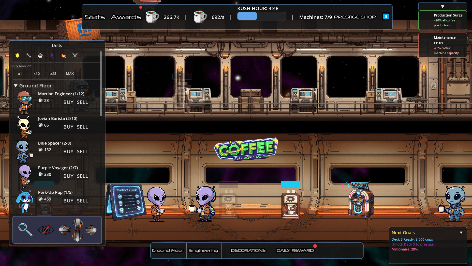 Bắt đầu bằng việc tự tay pha những ly cà phê đầu tiên, sau đó nhanh chóng thuê một đội ngũ 33 đơn vị người ngoài hành tinh độc đáo để tự động hóa mọi công đoạn kinh doanh của bạn. Lựa chọn từ các barista pha chế cà phê, kỹ thuật viên lắp đặt máy móc, khách quen tạo thu nhập thụ động, đơn vị hỗ trợ tăng cường sản xuất, và chiến binh bảo vệ trạm của bạn.