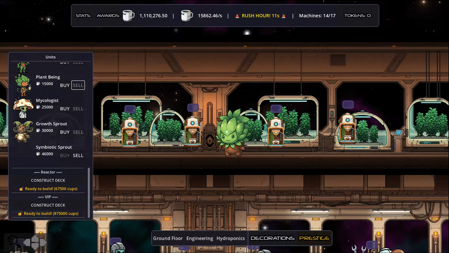 Expand your operation across 6 visually distinct decks, from the industrial Engineering bay to the lush Hydroponics garden, the cutting-edge Reactor level, the exclusive VIP lounge, and finally the Administrative deck. Each new deck unlocks more powerful units and boosts the production of your entire station!