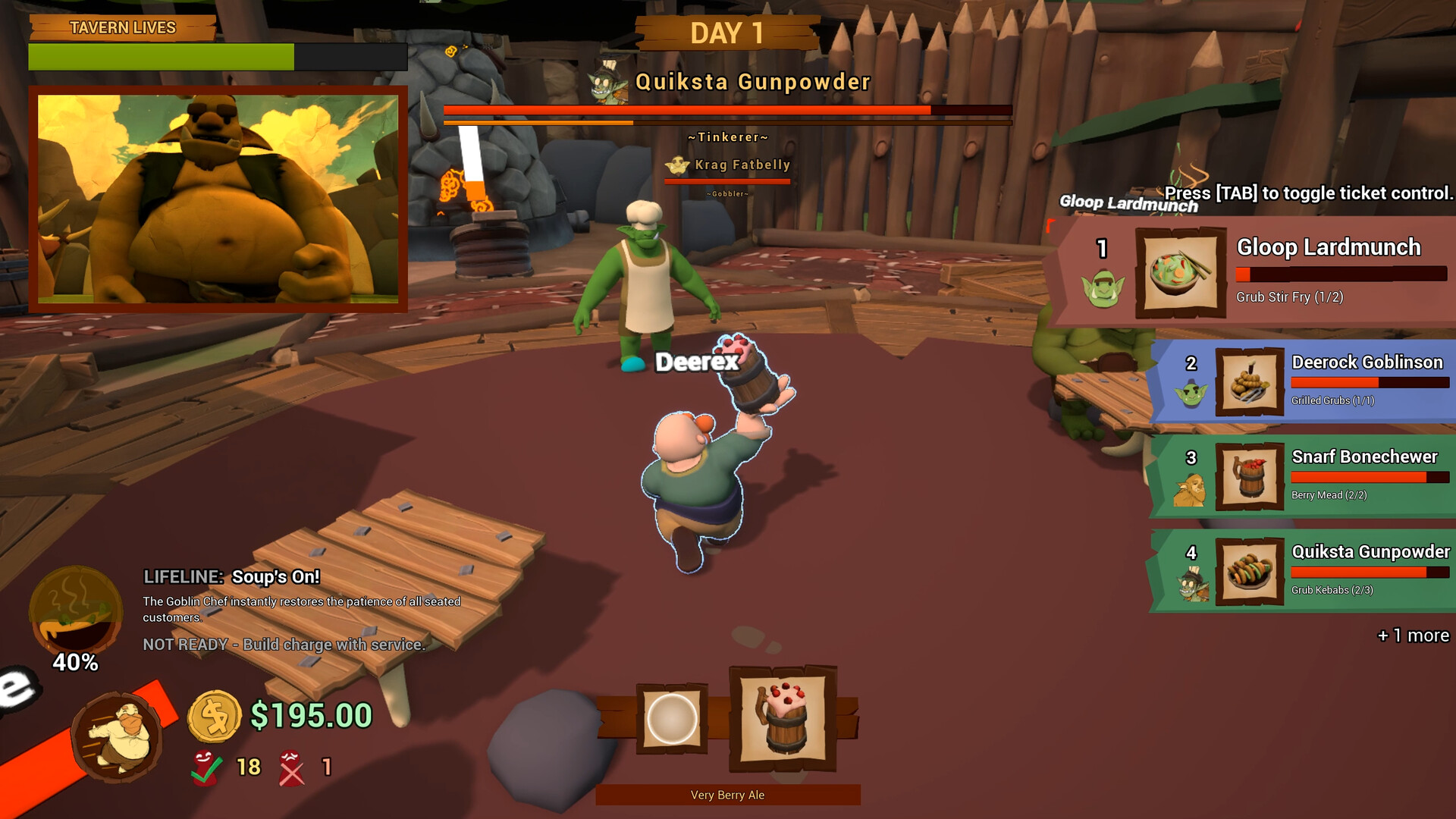 Serve customers with not only big appetites, but big personalities! Every tavern attracts fresh faces, from regular goblins, to bomb-slinging tinkerers, to trash-swallowing frog riders, each one with unique needs.
