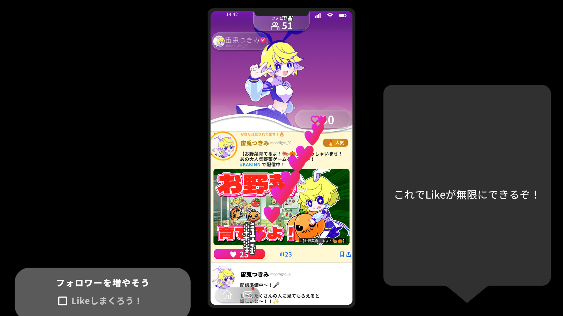 As the player, you support "Hiyori," your childhood friend who became a shut-in, in her activities as VTuber "Tsukimin." Experience an unprecedented clicker game using the familiar SNS "Like" button.