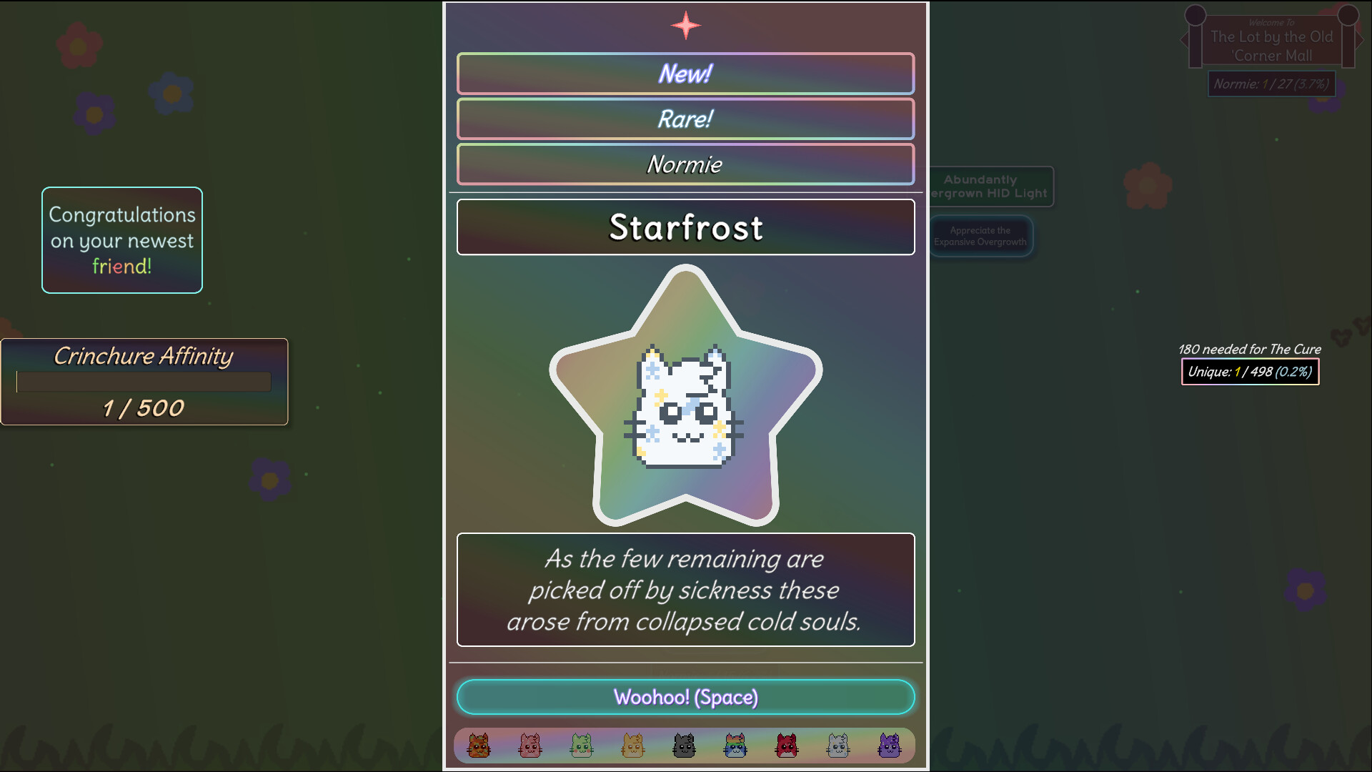A Gacha-Inspired Collectathon Game - FREE PULLS FOR LIFE!! Hundreds of cute Crinchures, sweet Swords, incredible Ingredients and more to collect, with a book's worth of flavor text and lore! Experience the joy of ripping packs, without those pesky microtransactions!