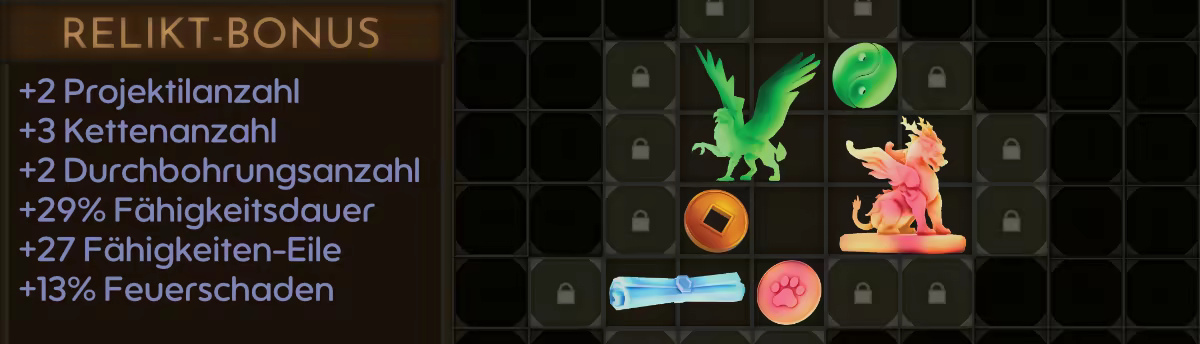Jedes Relikt bietet Boni: von zusätzlichen Projektileffekten über erhöhte Durchschlagskraft und zusätzliche Ketten bis hin zu Bonusschaden und mehr.