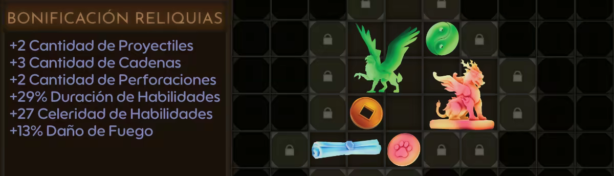 Cada Reliquia otorga bonificaciones: proyectiles adicionales, mayor perforación, rebotes en cadena, daño extra y mucho más.