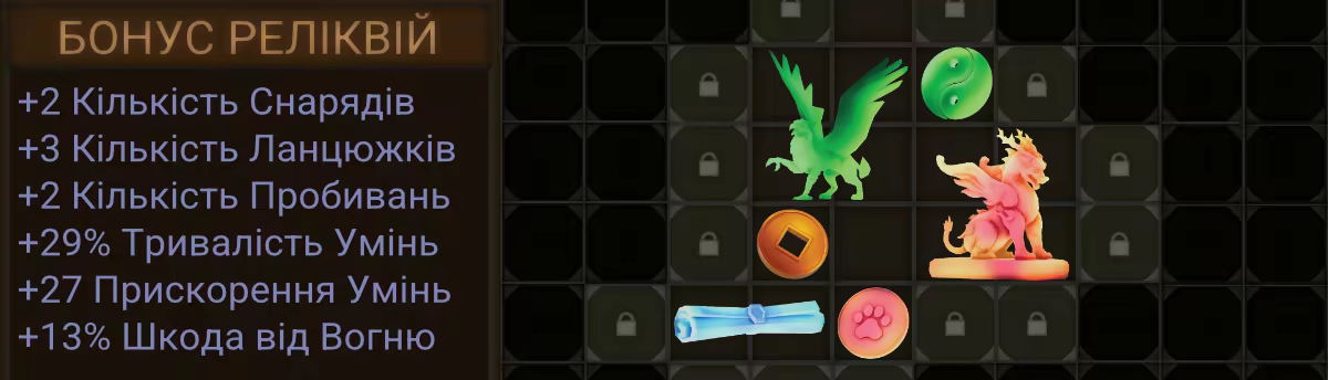 Кожна реліквія дає бонуси: додаткові снаряди, пробиття, ланцюгову атаку, підвищену шкоду тощо.