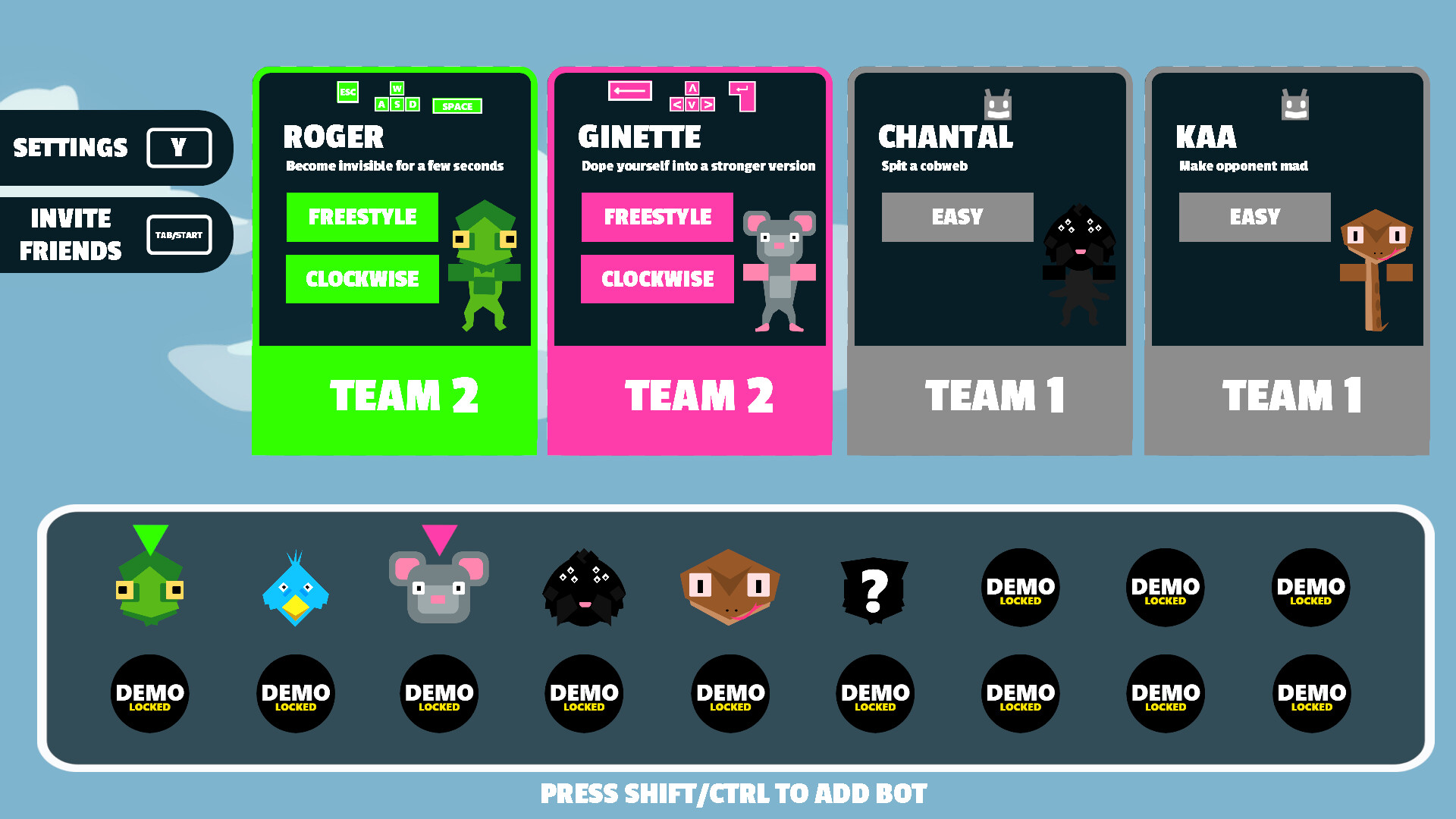 The replayability is infinite. Wanna spice things up? Play on random maps with random characters every round, or change the settings to make it super mega fun for you and your friends. For each mode numerous game settings are available!