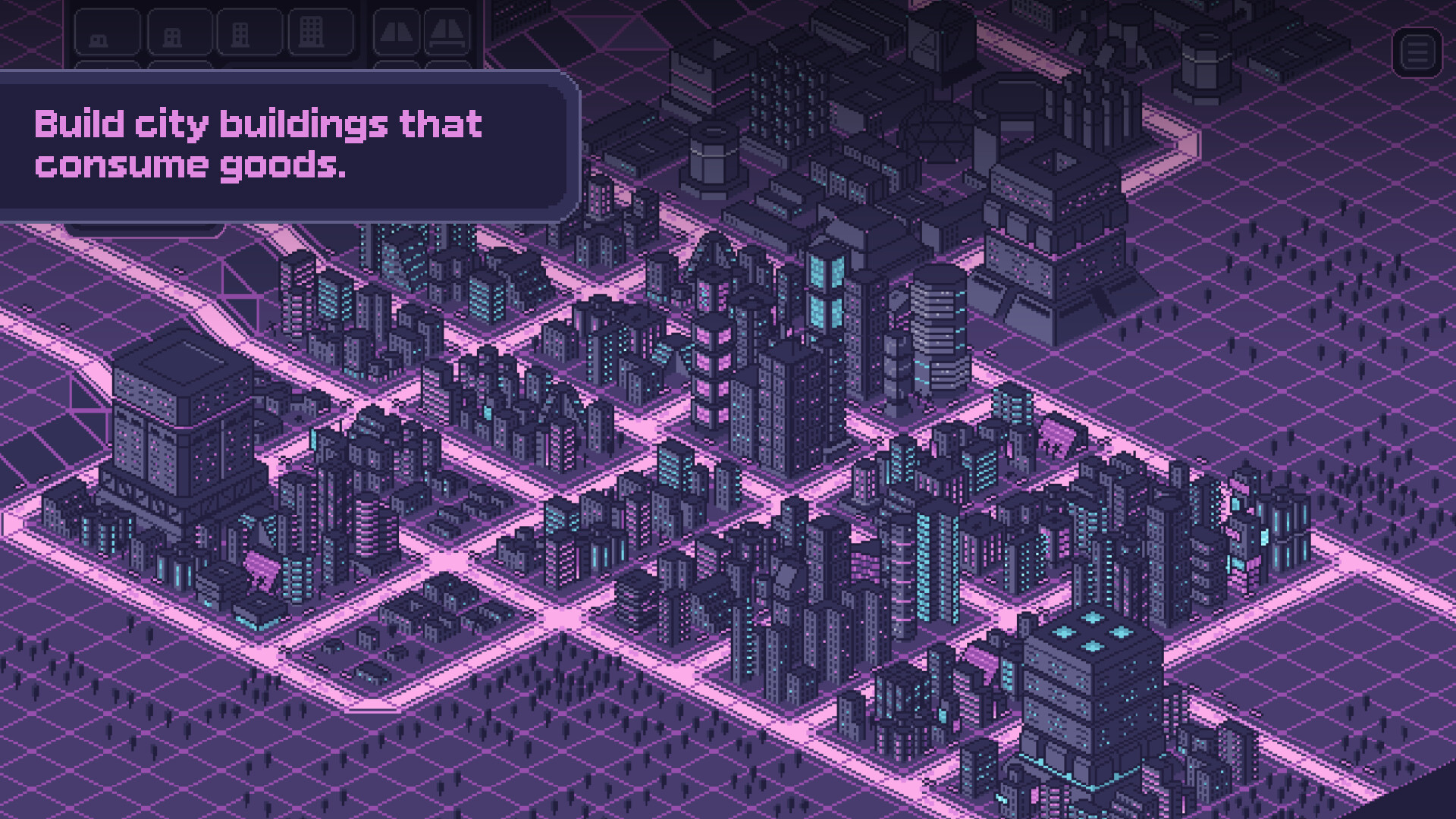Pixelpolis Neon is a retro-isometric city builder set in a vibrant cyberpunk future. Place over 400 hand-drawn pixel art buildings, balance population and available goods, and craft your own neon-lit dream city to the sound of pulsating synthwave.