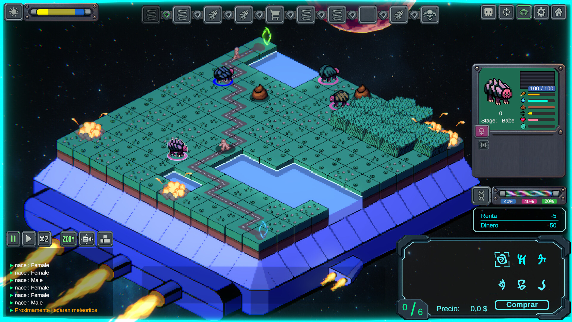 • Innovative Breeding System: Creatures choose who to reproduce with (even with enemy creatures). Try to make them choose who you want (inbreeding may occur).