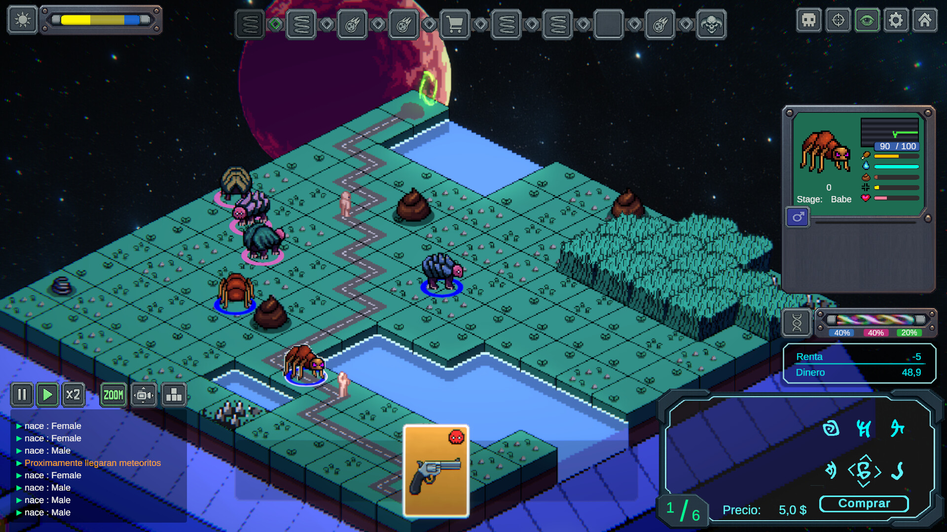 • Innovative Breeding System: Creatures choose who to reproduce with (even with enemy creatures). Try to make them choose who you want (inbreeding may occur).