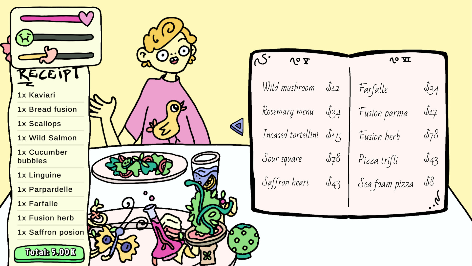 Meet Menu is a cute and silly dating game where you order pricey meals while your date pays! Choose wisely, gross combos can end the date, while perfect ones boost the bill! Upgrade partners and climb to fancier restaurants!
