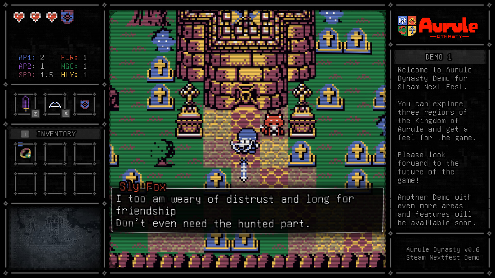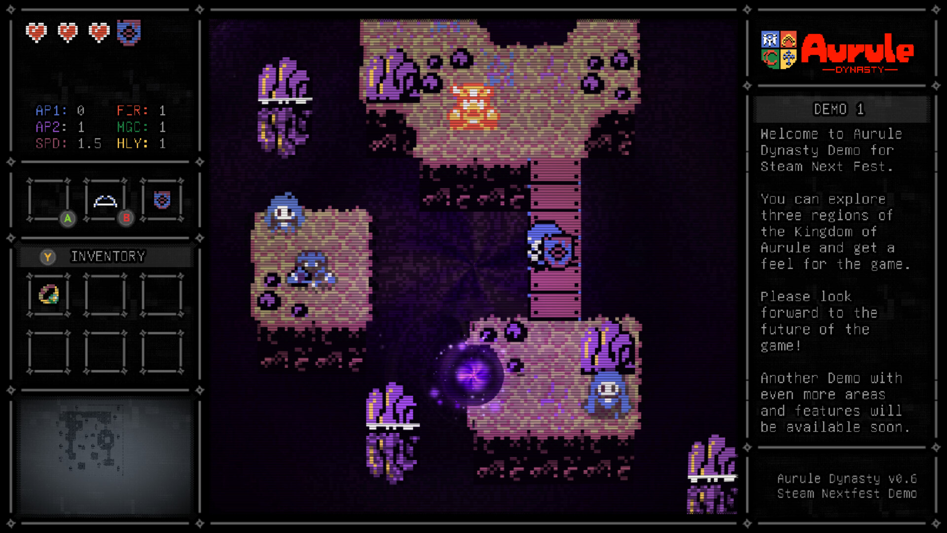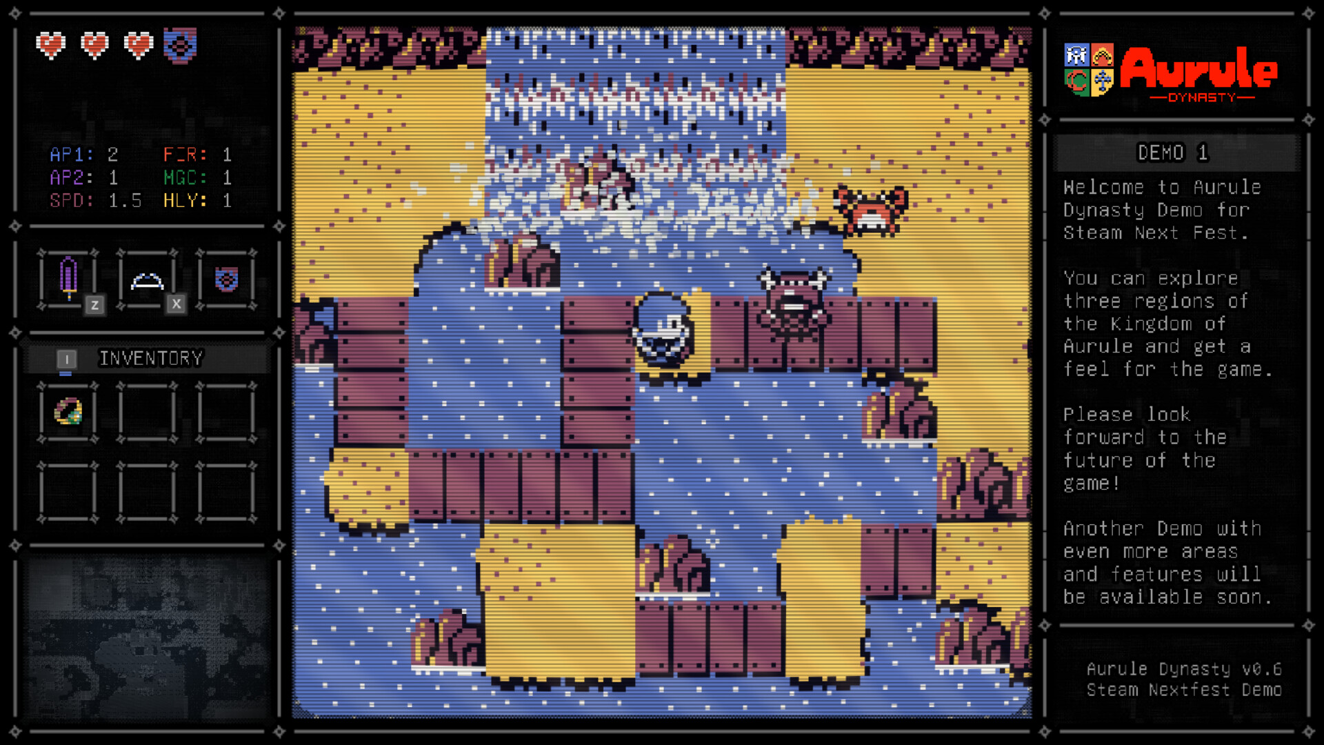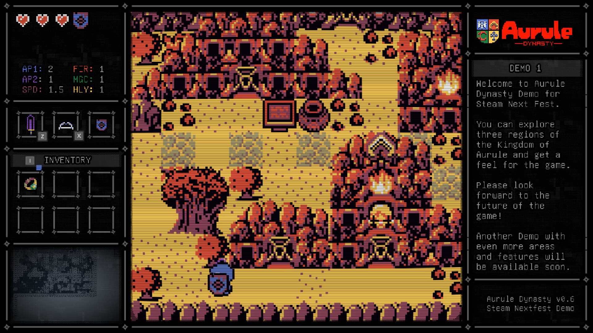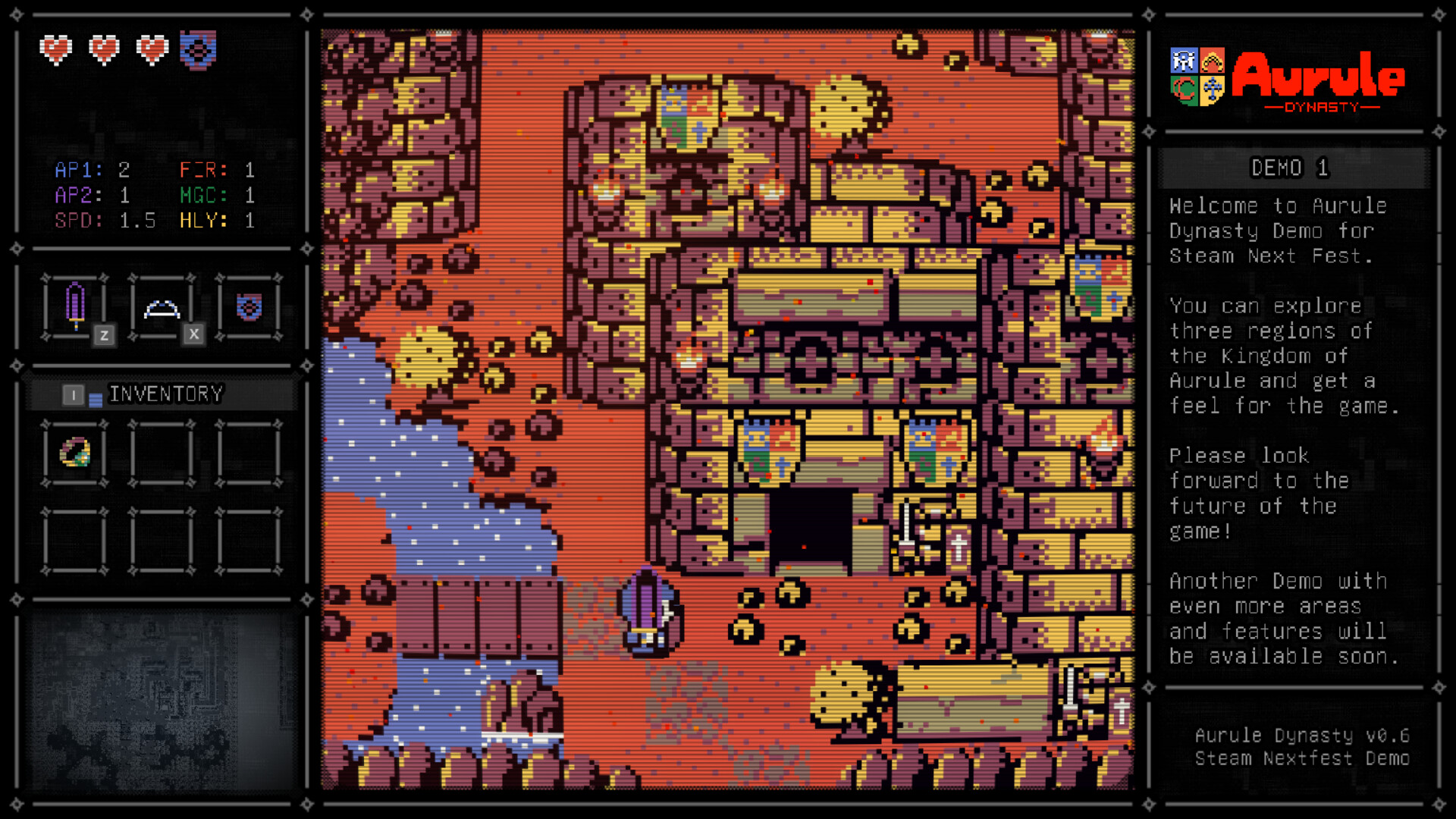 In Aurule Dynasty Demo you'll be able to explore the western half of the Kingdom of Aurule, which includes: a desert area, the mountains, the lake and a grassy area, and finally the dead woods to the south.