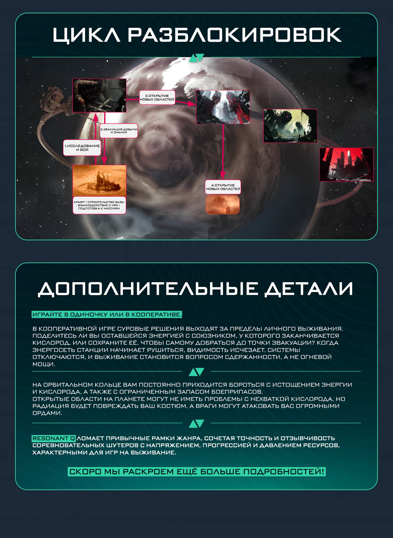 Resonant Q — это survival‑экшен в жанре космического хоррора для 1–3 игроков, действие которого происходит на обветшалом орбитальном кольце. Поднимайтесь на орбитальное кольцо, охотьтесь на аномалии и приносите добычу на развивающуюся базу, чтобы создавать новые предметы и тянуться к звёздам.