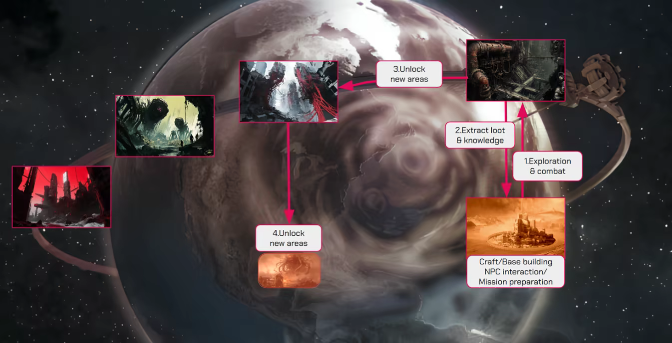 Starting from the Slums ascend the Space Elevator to the Orbital Ring, gather resources, extract safely, and use your haul to craft, build, and progress. Crafting items to repair mechanisms on the Orbital Ring will allow further areas to be unlocked, both on the Ring and on the planet.