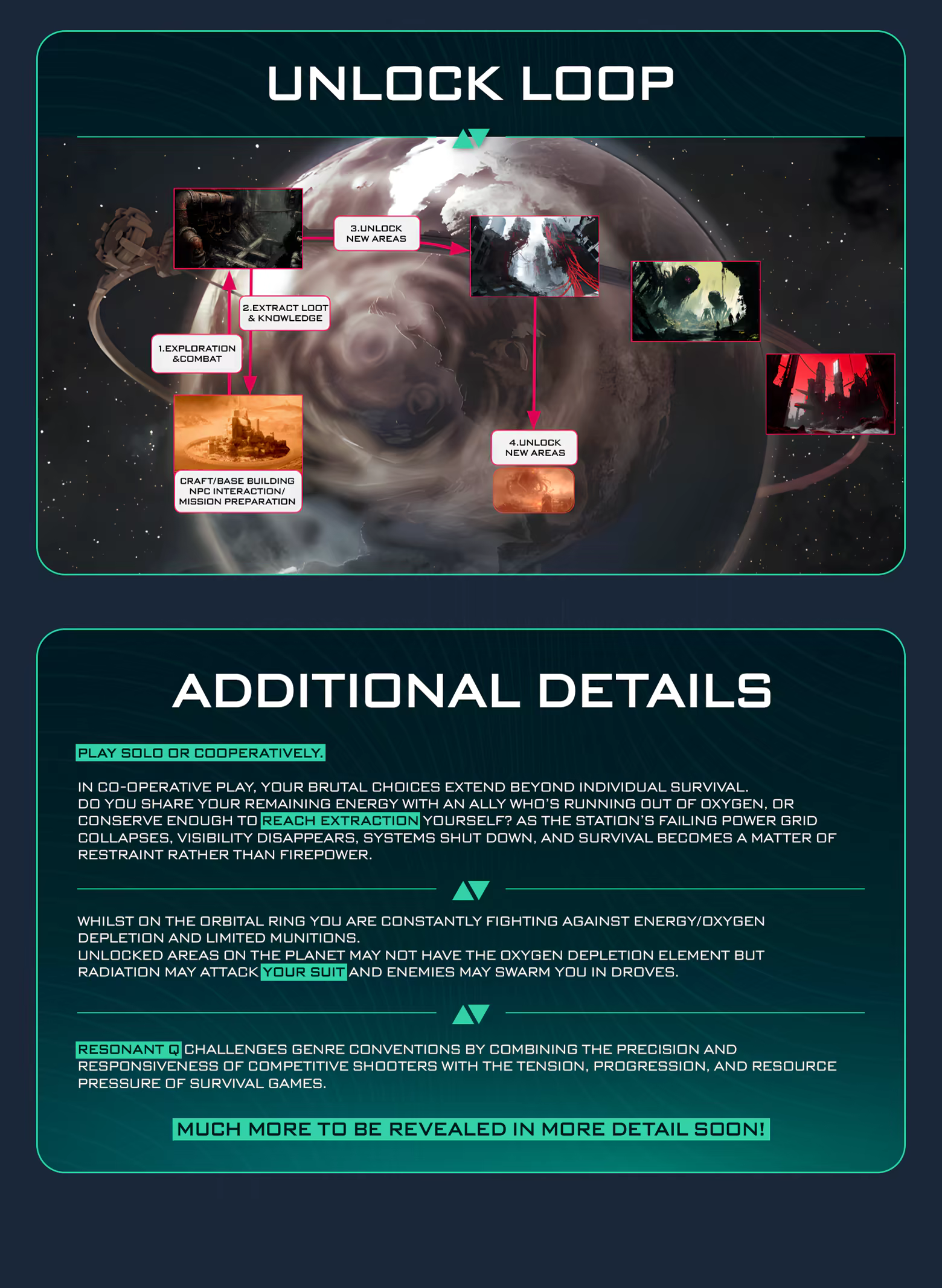 Resonant Q is a cosmic horror survival action game for 1–3 players, set on a dilapidated Orbital Ring. Ascend to the Orbital Ring, hunt anomalies, take loot back to an evolving base to craft new items to reach the stars.